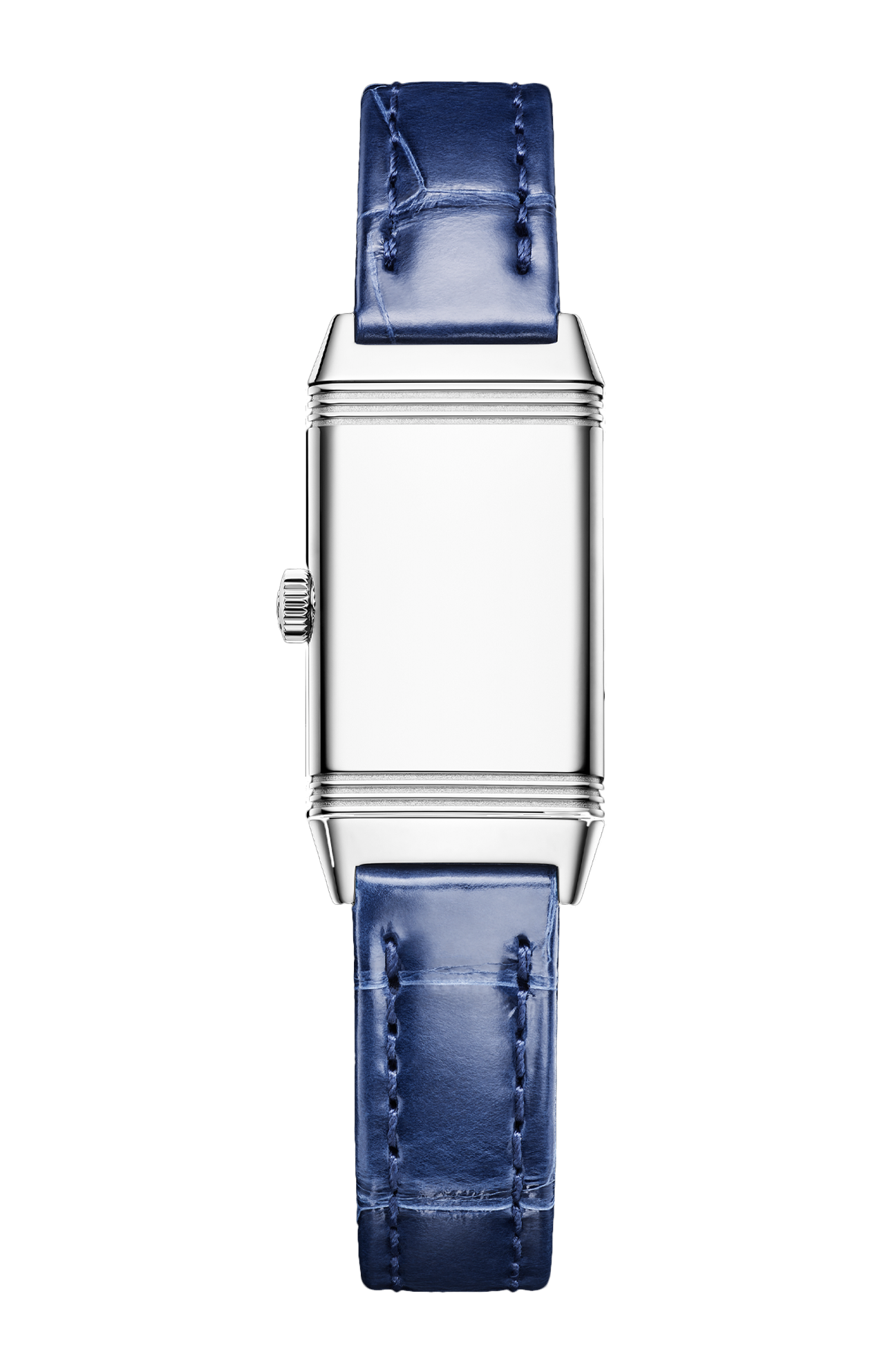 Il Reverso Classic Monoface Origin, con la sua sottile silhouette rettangolare (16,3 mm di larghezza), ricorda le proporzioni delle prime casse Reverso da donna degli anni ‘30. Dotato di un movimento al quarzo, l’orologio presenta le funzioni ore e minuti su un fronte dalle linee pulite ed essenziali, impreziosito dalla doppia finitura del quadrante, guilloché all’interno e spazzolato verticalmente all’esterno. Il quadrante argentato ospita 12 numeri arabi e lancette dauphine azzurrate che riprendono il blu del cinturino in pelle di alligatore delicatamente brillante. Come suggerisce il nome dell’orologio, il retro può essere personalizzato incidendo un motivo, una data o delle iniziali.