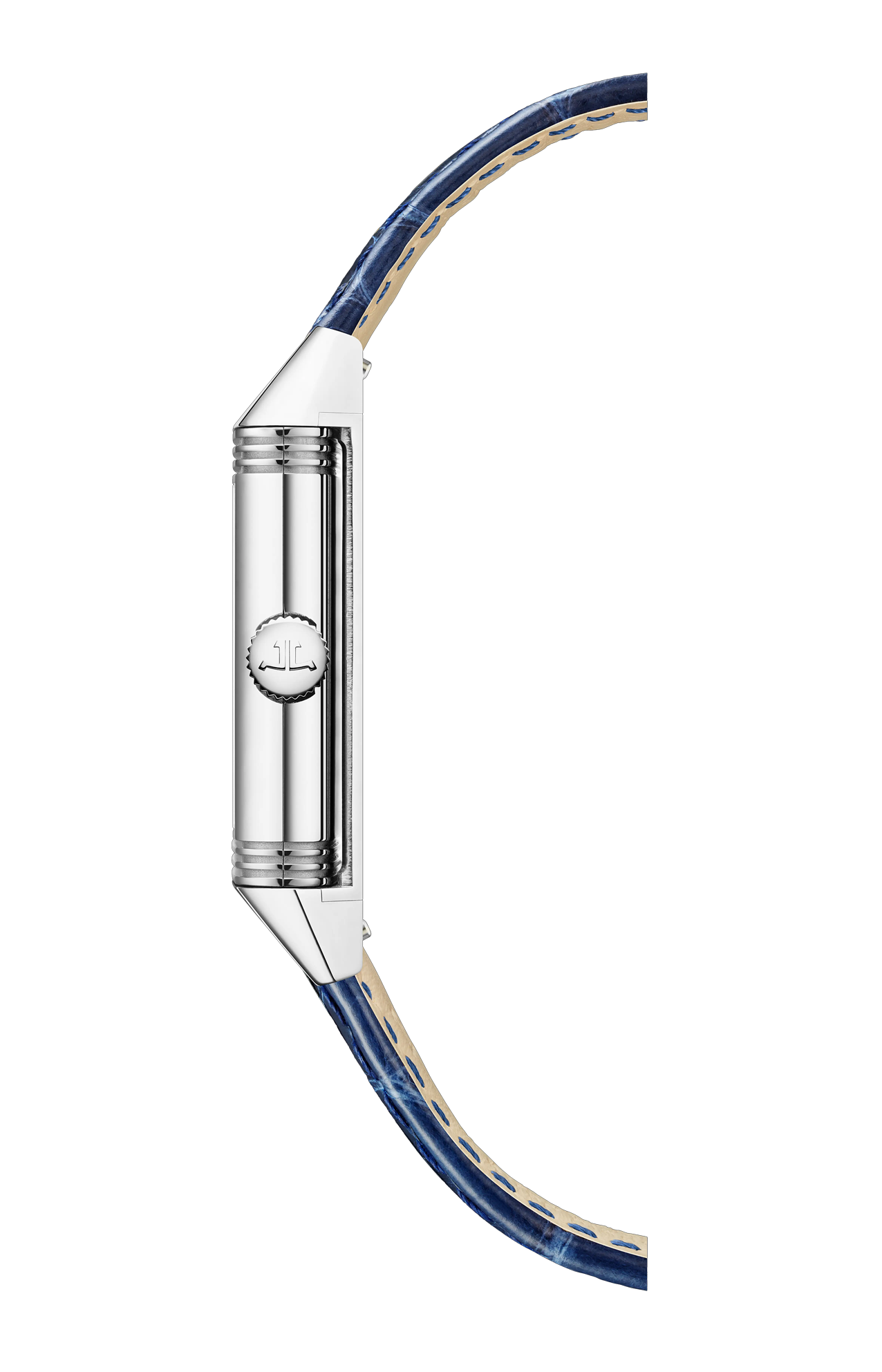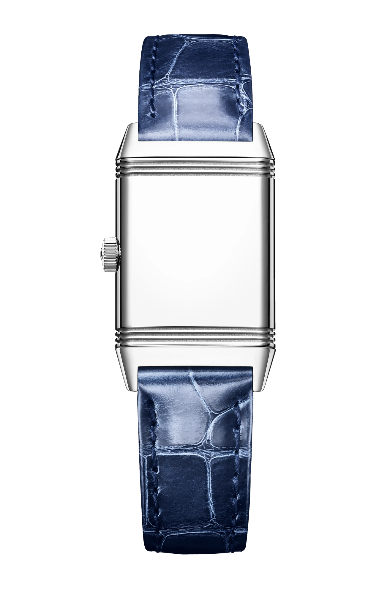Gli emblematici codici estetici dello stile Art Déco e le linee dell’iconico reverso sono ancora una volta rispettati in questo segnatempo reverso Classic Small in acciaio, dotato di un elegante cinturino in pelle blu, intercambiabile secondo i desideri del giorno o della notte. Proporzioni perfette e simmetria: questo modello femminile è tanto classico quanto intramontabile. La sua pura raffinatezza si manifesta, tra l’altro, nella sobrietà del quadrante satinato verticalmente con centro opalino.
