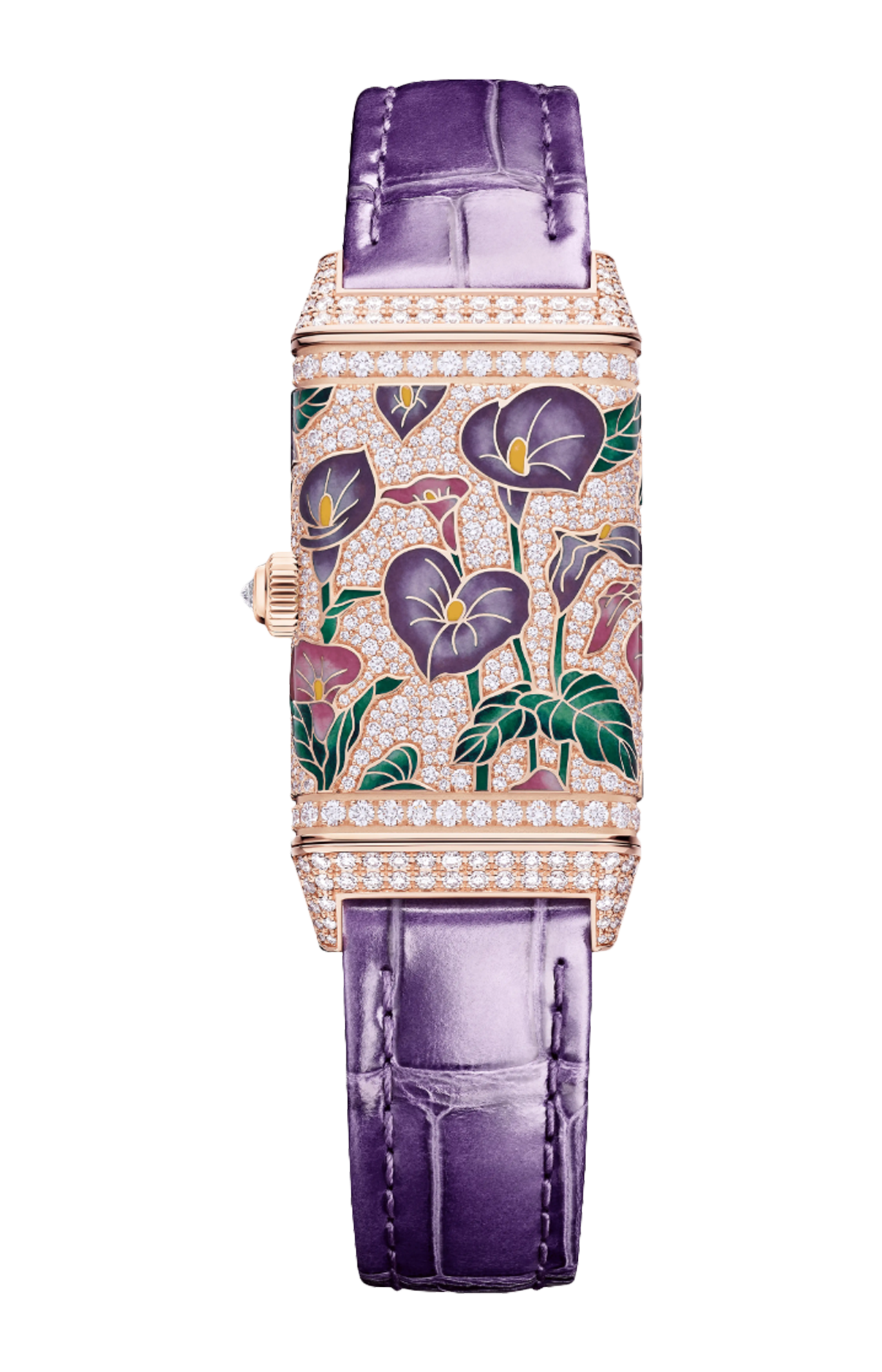 Nel giardino degli orologi Reverso One spicca un bouquet di calle viola. Il Reverso One Precious Flowers unisce la maestria orologiera e l’alta gioielleria in un’espressione artistica originale e raffinata. Ci sono volute 130 ore agli artigiani del nostro atelier dei mestieri rari™ per dare vita a questo orologio-gioiello che coniuga le tecniche di smaltatura Champlevé Grand Feu e di incastonatura a neve e a grani. Su entrambi i lati del quadrante, i fiori di calla smaltati invitano a scoprire il retro. Una volta capovolto, l’orologio presenta un motivo floreale dai colori vivaci su un tappeto di diamanti incastonati a neve. In totale, sono stati meticolosamente incastonati oltre 600 diamanti taglio brillante. Edizione limitata di 10 esemplari.