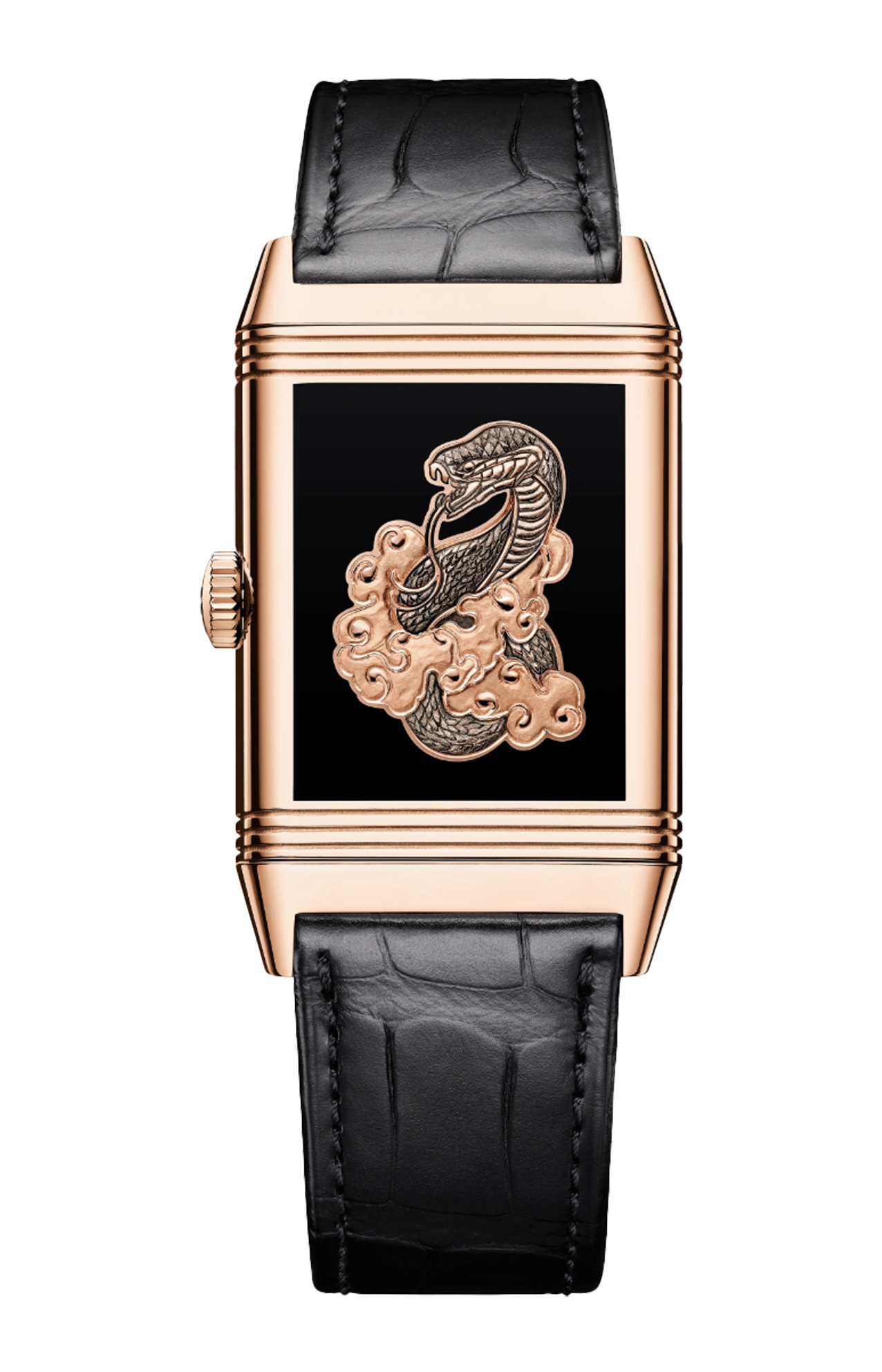 Come omaggio all’astrologia cinese, il reverso tribute enamel creato presso il nostro atelier dei mestieri rari offre una splendida cornice al serpente, l’animale zodiacale del 2025. Sia sul fronte che sul retro, i quadranti nero profondo sono smaltati grand feu. Liscio e brillante, questo colore si ottiene dopo diverse fasi di smaltatura e successivi passaggi in forno (800 °C). Sul retro, l’incisione di un maestoso serpente circondato dalle fiamme ha richiesto ai nostri artigiani oltre 80 ore di lavoro. Ai lati del fronte elegantemente sobrio e del retro meticolosamente inciso, il cinturino in alligatore nero aggiunge un tocco di ricercatezza finale. Un orologio raffinato che ha come colori preferiti l’oro rosa e il nero.