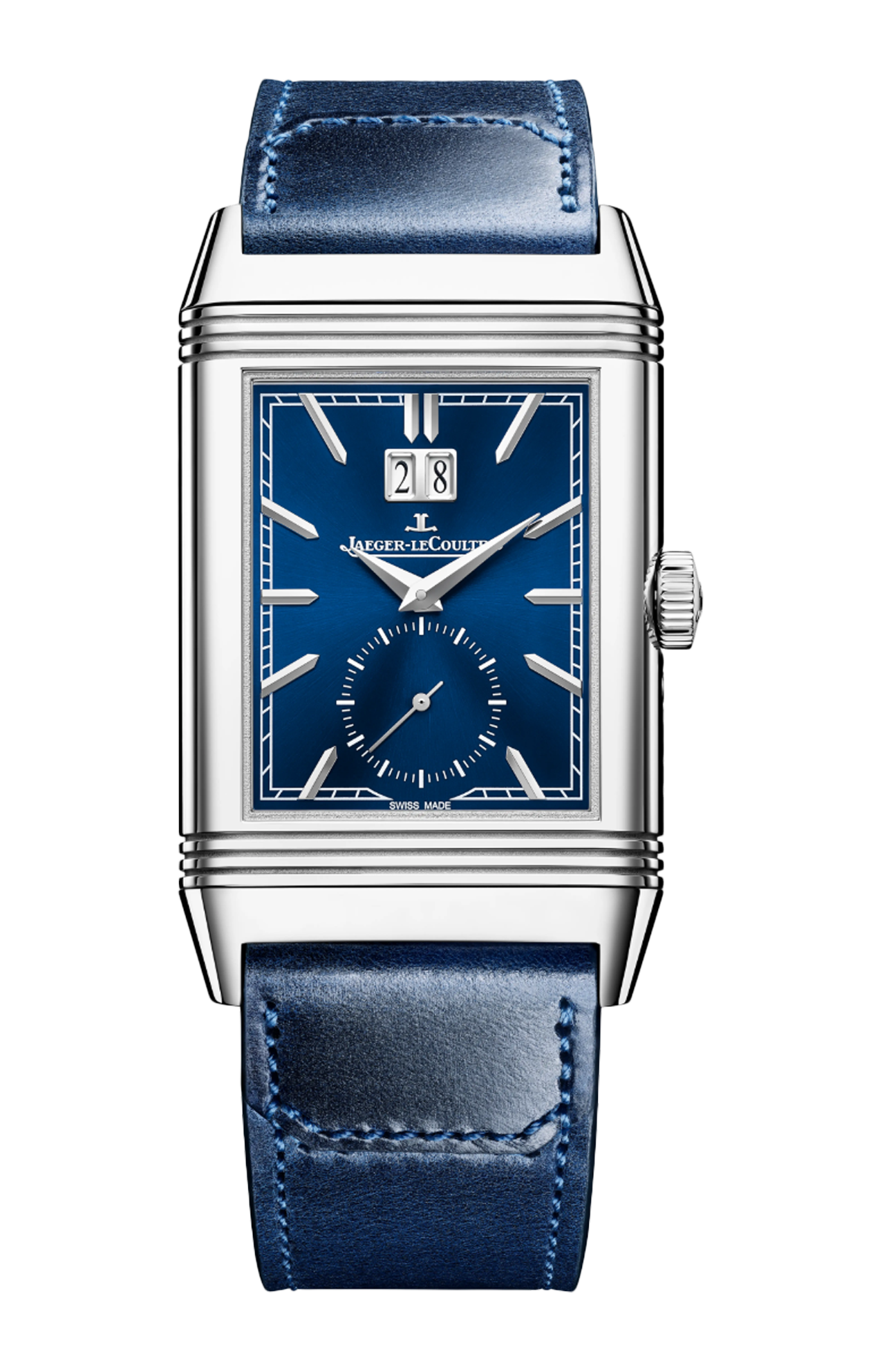 Ispirato ai primi modelli del 1931, il Reverso Tribute Geographic è l’emblema della competenza orologiera della grande maison. Sul fronte, il quadrante blu laccato in stile Art Déco presenta un meccanismo brevettato grande date che offre un’eccellente leggibilità. Sul retro, la visualizzazione della complicazione delle ore del mondo è tanto originale quanto istintiva. Il disco dei 24 fusi orari è rotante, mentre i nomi delle città sono incisi direttamente sulla cassa in acciaio. Al centro, i continenti con finitura lucida argentata si stagliano su oceani blu laccati a mano. La regolazione avviene tramite un pulsante che consente correzioni a salti di un’ora. L’orologio viene fornito con due bracciali disegnati da Casa Fagliano: il primo in pelle blu; il secondo, dello stesso colore, in pelle e tela.