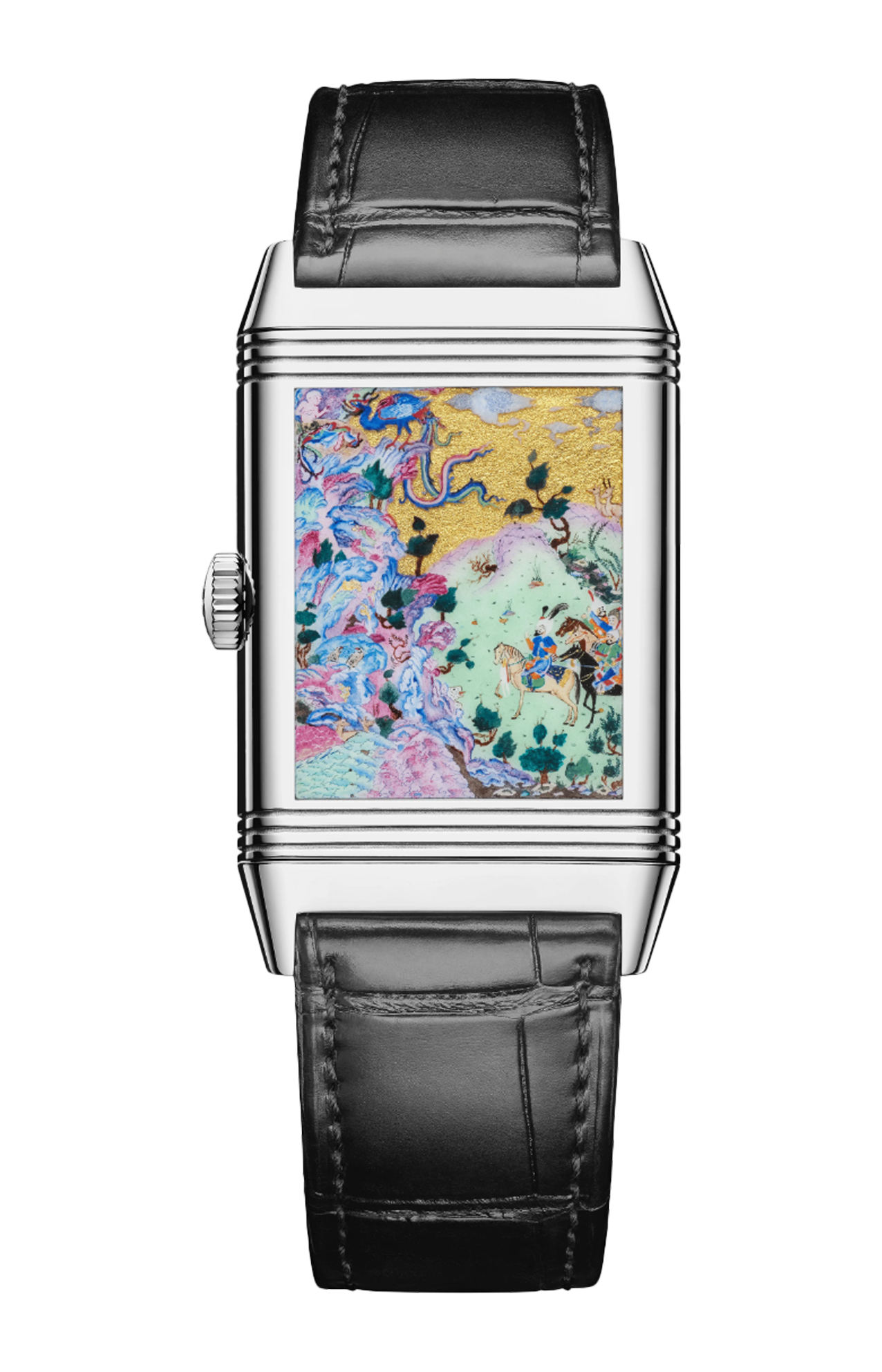 L’orologio Reverso Tribute Enamel “Shahnameh” vanta un quadrante guilloché con un motivo a onde sul davanti e una finitura in smalto verde grand feu, che invita chi lo indossa a scoprire la magia del famoso libro dei re (“Shahnameh” in persiano) scritto da Firdusi. Sul retro dell’orologio, un dipinto in miniatura impreziosito da foglie d’oro (24 carati, 999/1000) e colori vivaci racconta la storia di un re e dei suoi vassalli a cavallo alla ricerca del figlio principesco disperso tra le montagne, che verrà presto salvato da un uccello magico. In un tripudio di forme e colori, questa scena è il risultato di diverse competenze complesse. Sul retro, in una superficie di soli 2 cm², brilla il frutto delle 100 ore di lavoro che gli artigiani del nostro atelier dei mestieri rari™ hanno dedicato alla smaltatura e alla cottura in forno.