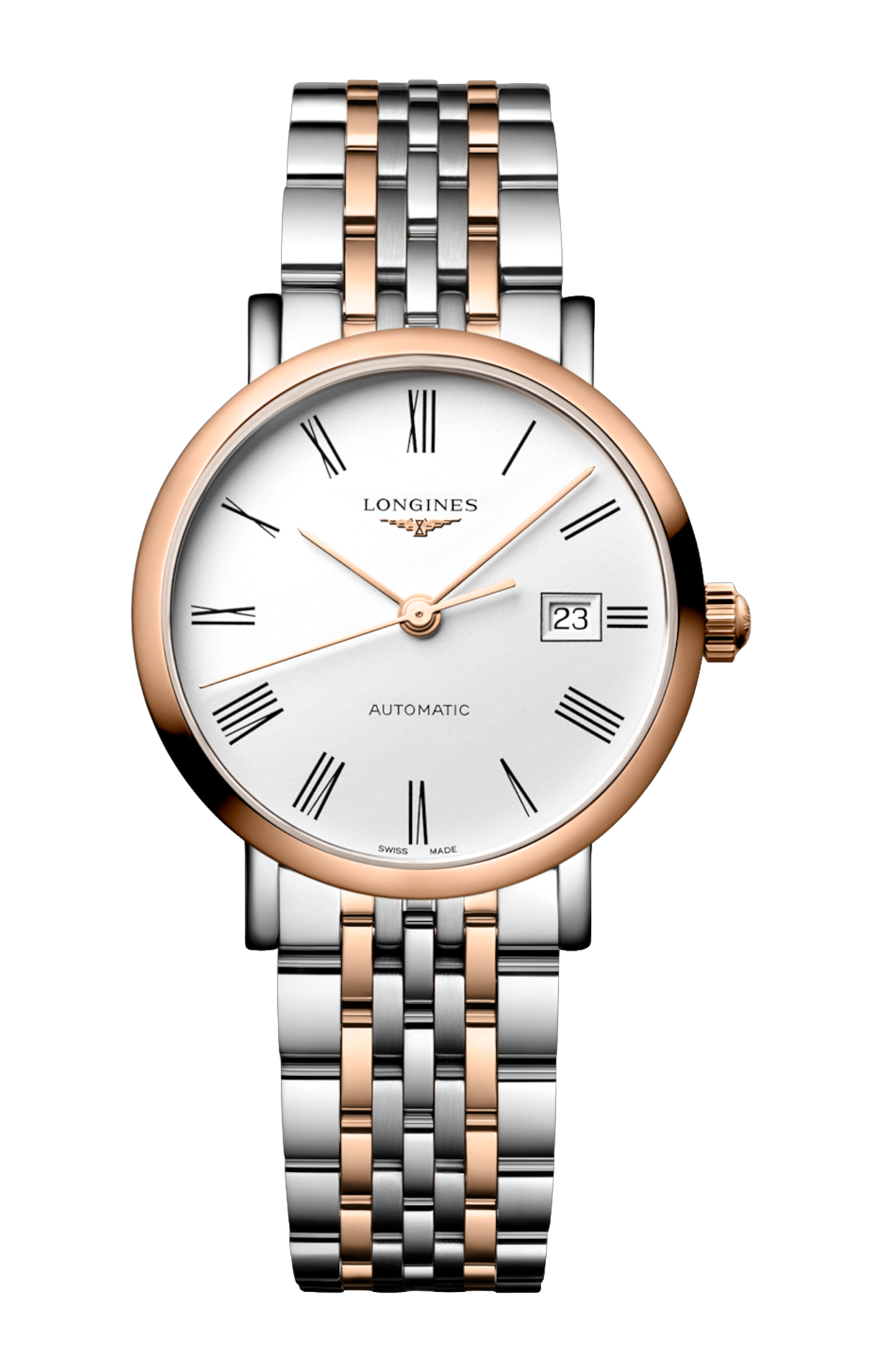 OROLOGIO AUTOMATICO, Ø 29.00 MM, ACCIAIO INOSSIDABILE E LUNETTA GIREVOLE BIDIREZIONALE CON INSERTO SPAZZOLATO CIRCOLARE SOVRASTATO DA UNA COIFFE IN ORO ROSA 18 CARATI 5N, L4.310.5.18.7 DATE, MOVIMENTO MECCANICO A CARICA AUTOMATICA CON FREQUENZA DI 28'800 ALTERNANZE ORARIE E RISERVA DI CARICA DI CIRCA 45 ORE, BILANCIERE-SPIRALE IN SILICIO MONOCRISTALLINO. IMPERMEABILE FINO A 3 BAR, VETRO ZAFFIRO ANTIGRAFFIO. QUADRANTE BIANCO MAT. BRACCIALE IN ACCIAIO INOSSIDABILE E LUNETTA GIREVOLE BIDIREZIONALE CON INSERTO SPAZZOLATO CIRCOLARE SOVRASTATO DA UNA COIFFE IN ORO ROSA 18 CARATI 5N, CON CHIUSURA DÉPLOYANTE A TRIPLA SICUREZZA E MECCANISMO DI APERTURA A PRESSIONE.