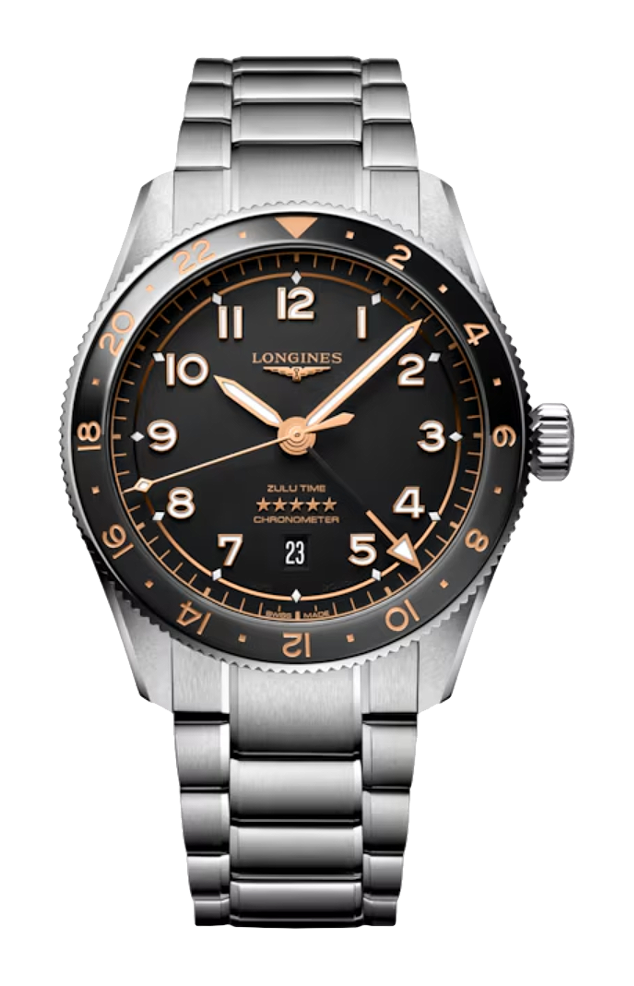 GMT date, movimento meccanico a carica automatica con frequenza di 25'200 alternanze orarie e riserva di carica di circa 72 ore, bilanciere-spirale in silicio monocristallino. Lunetta girevole bidirezionale corona a vite, impermeabile fino a 10 bar, vetro zaffiro antigraffio con trattamento antiriflesso multistrato su entrambi i lati. Quadrante nero mat, Swiss Super-Luminova®. Bracciale in acciaio inossidabile, con chiusura déployante a doppia sicurezza e meccanismo di apertura a pressione.