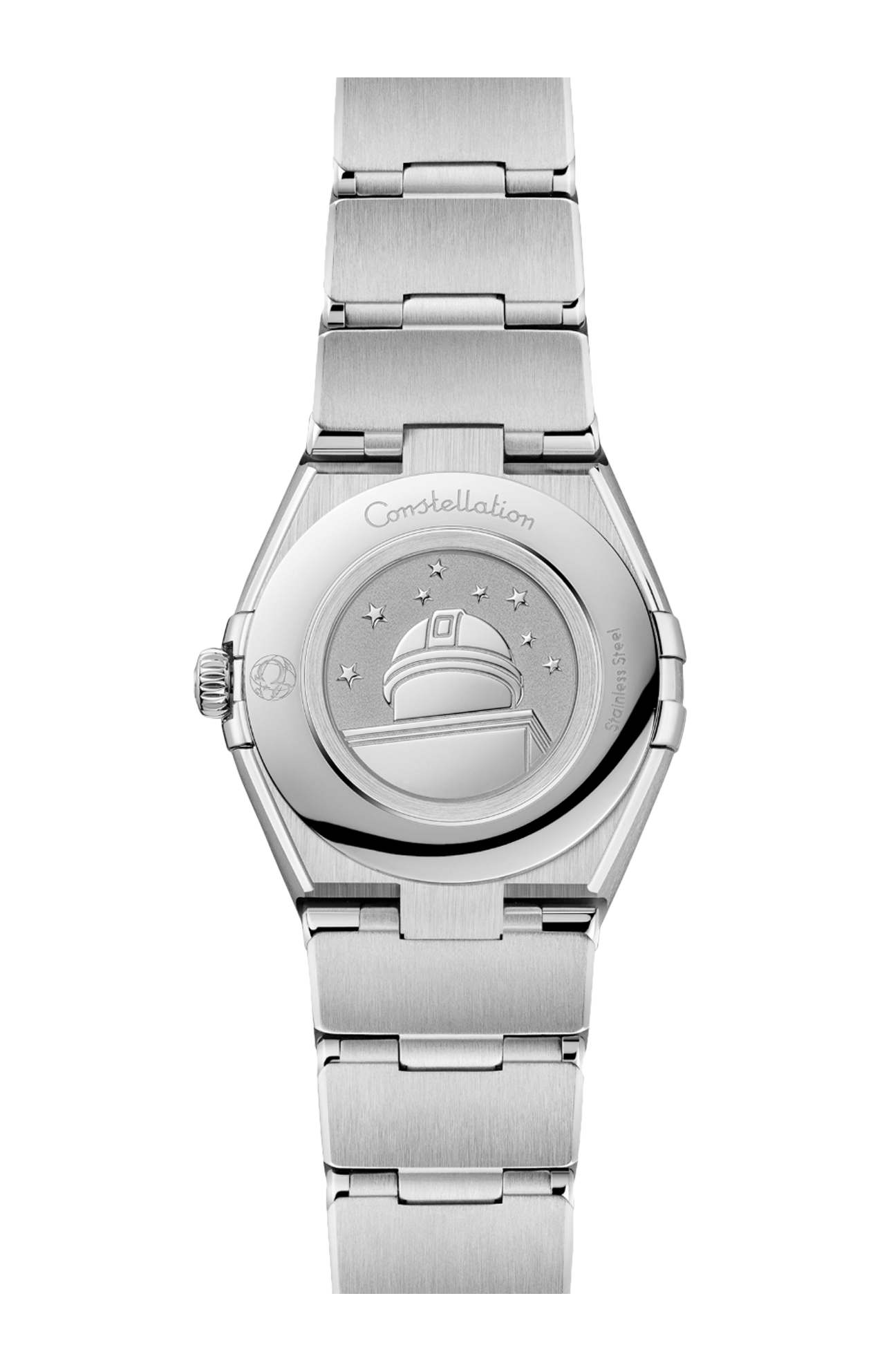 Alloggiato dietro al fondello caratterizzato da un medaglione Constellation con impressa l’effigie dell’osservatorio, anima l’orologio il calibro Omega 4061.