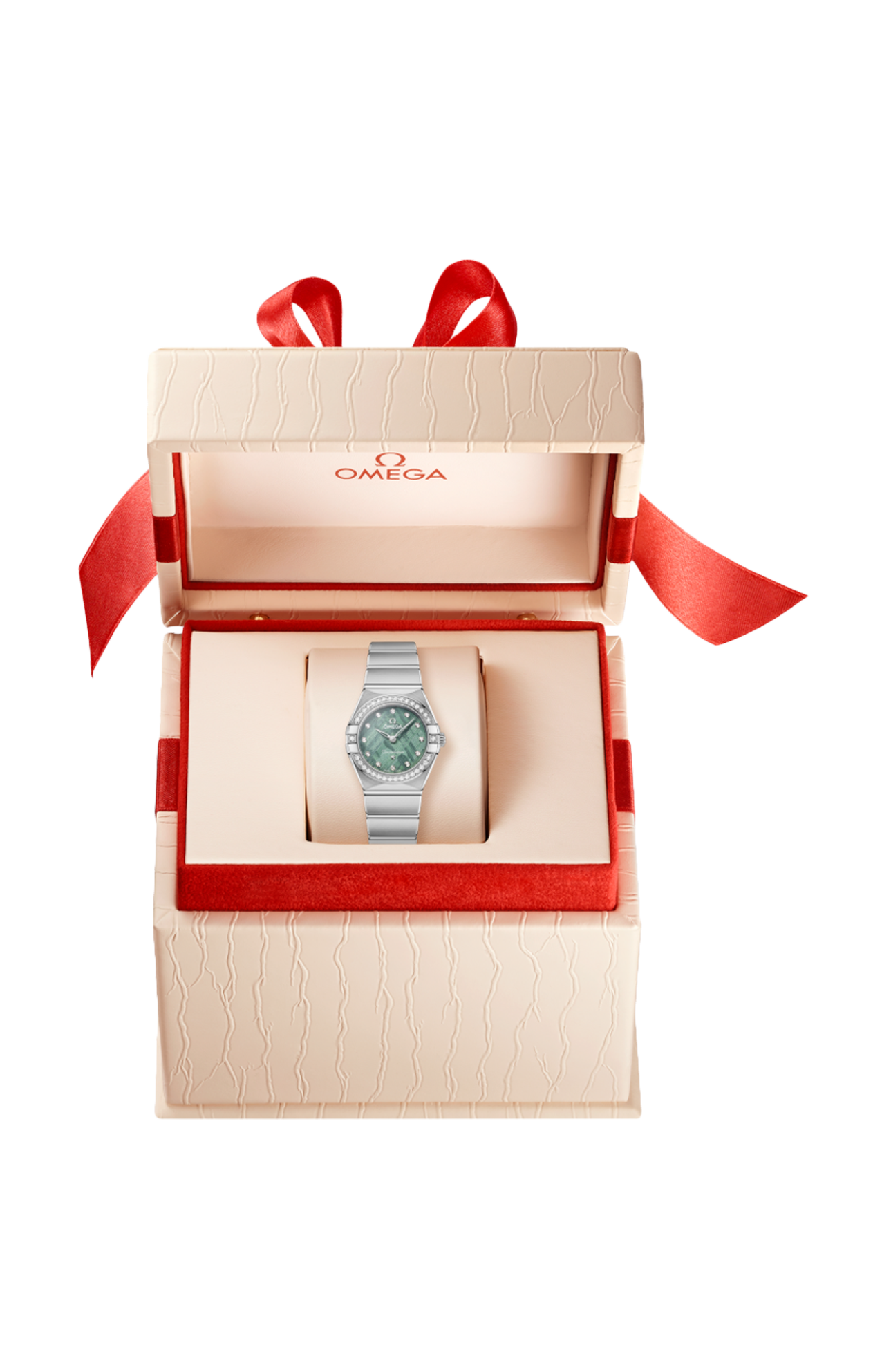 L’orologio presenta una cassa da 25 mm corredata da un bracciale “Mono Rang” in acciaio inossidabile e integra molte delle caratteristiche distintive della linea Constellation, come le griffe lucide, le sfaccettature a mezzaluna e la lunetta tempestata di diamanti.