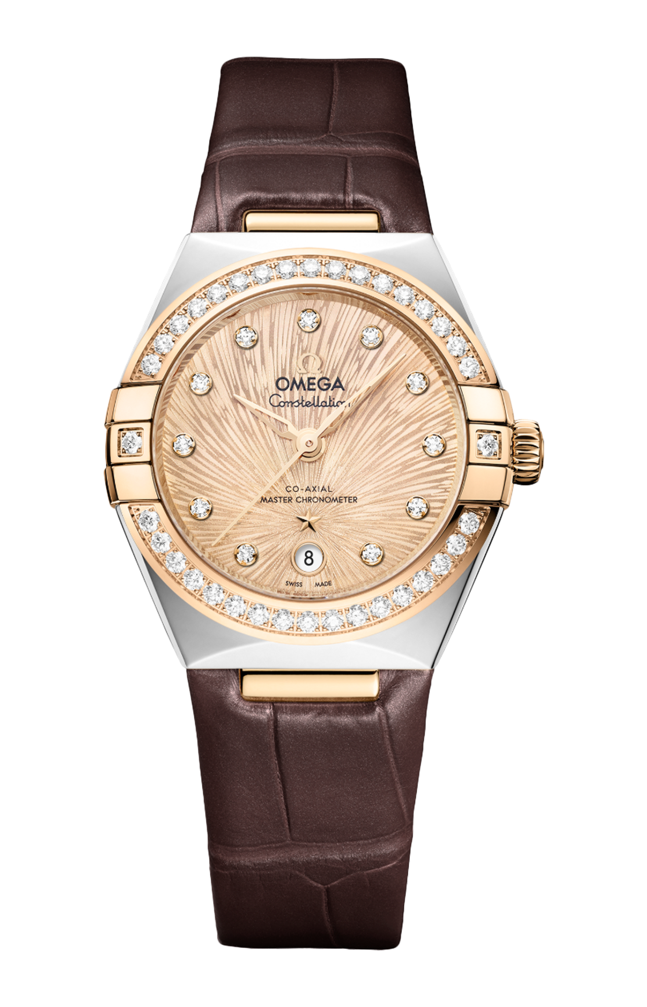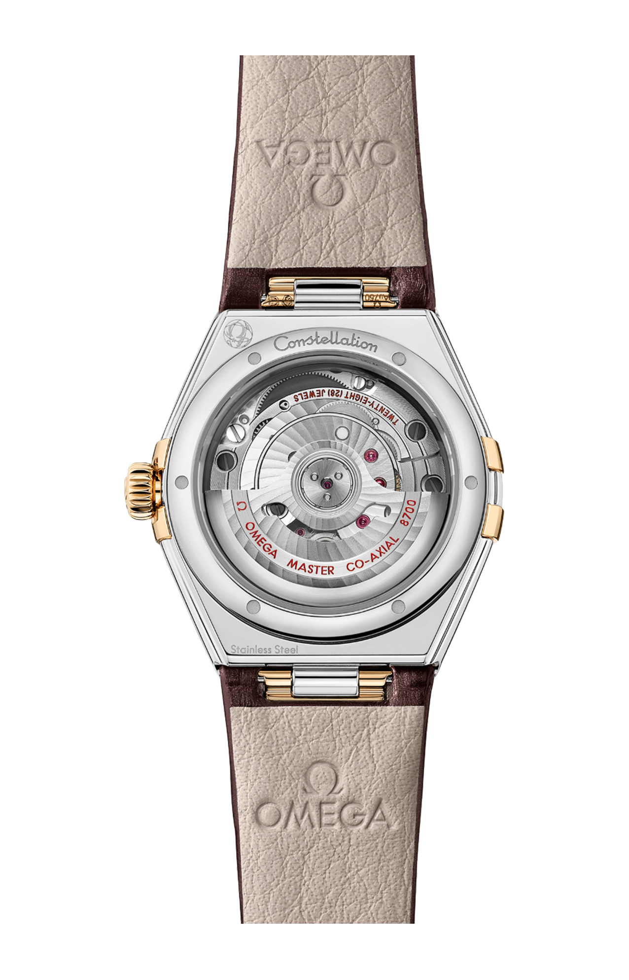 L'orologio, corredato da un cinturino in pelle marrone scintillante, è animato dal calibro Omega Co-Axial Master Chronometer 8700, visibile attraverso il fondello in vetro zaffiro.