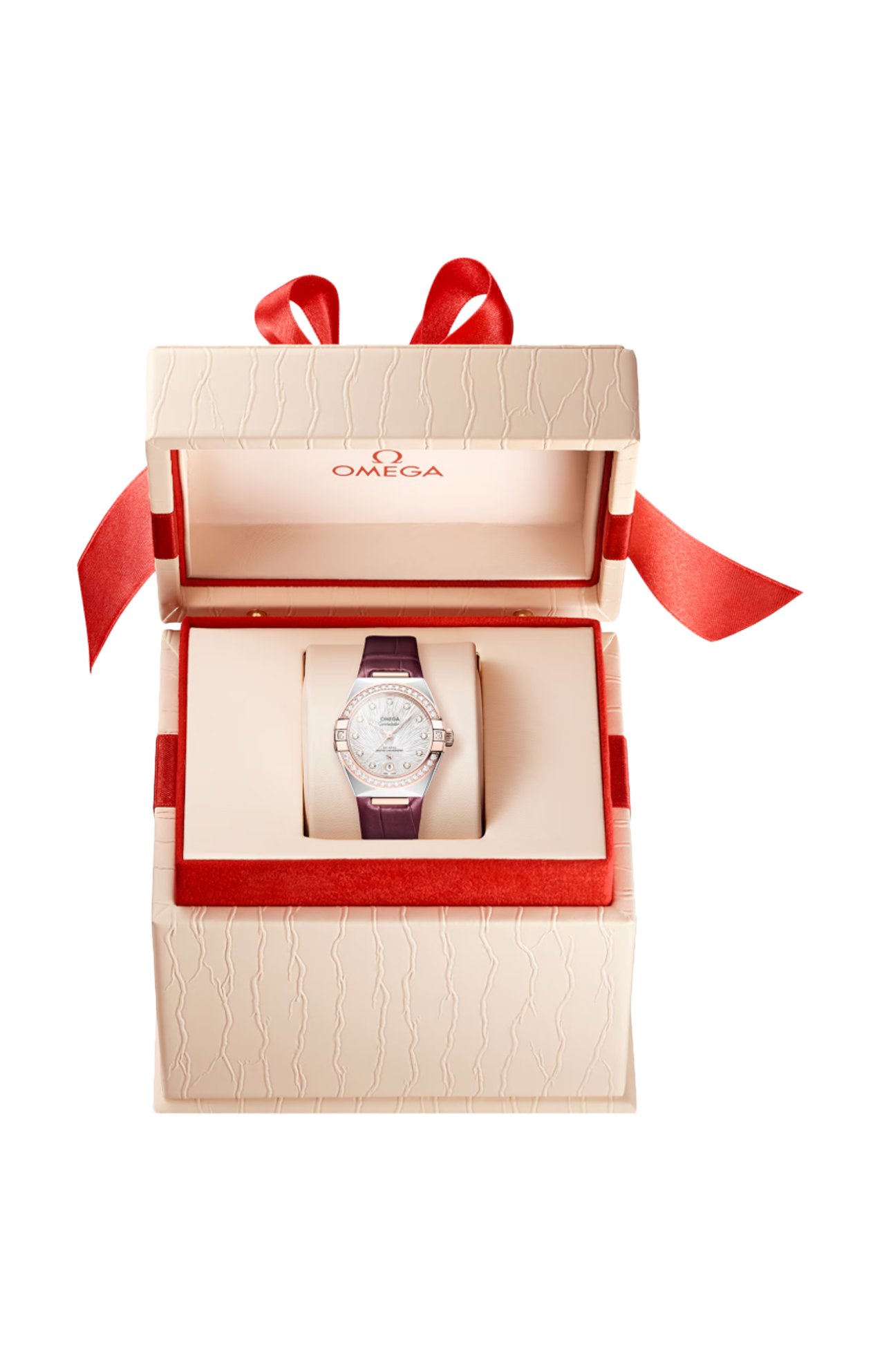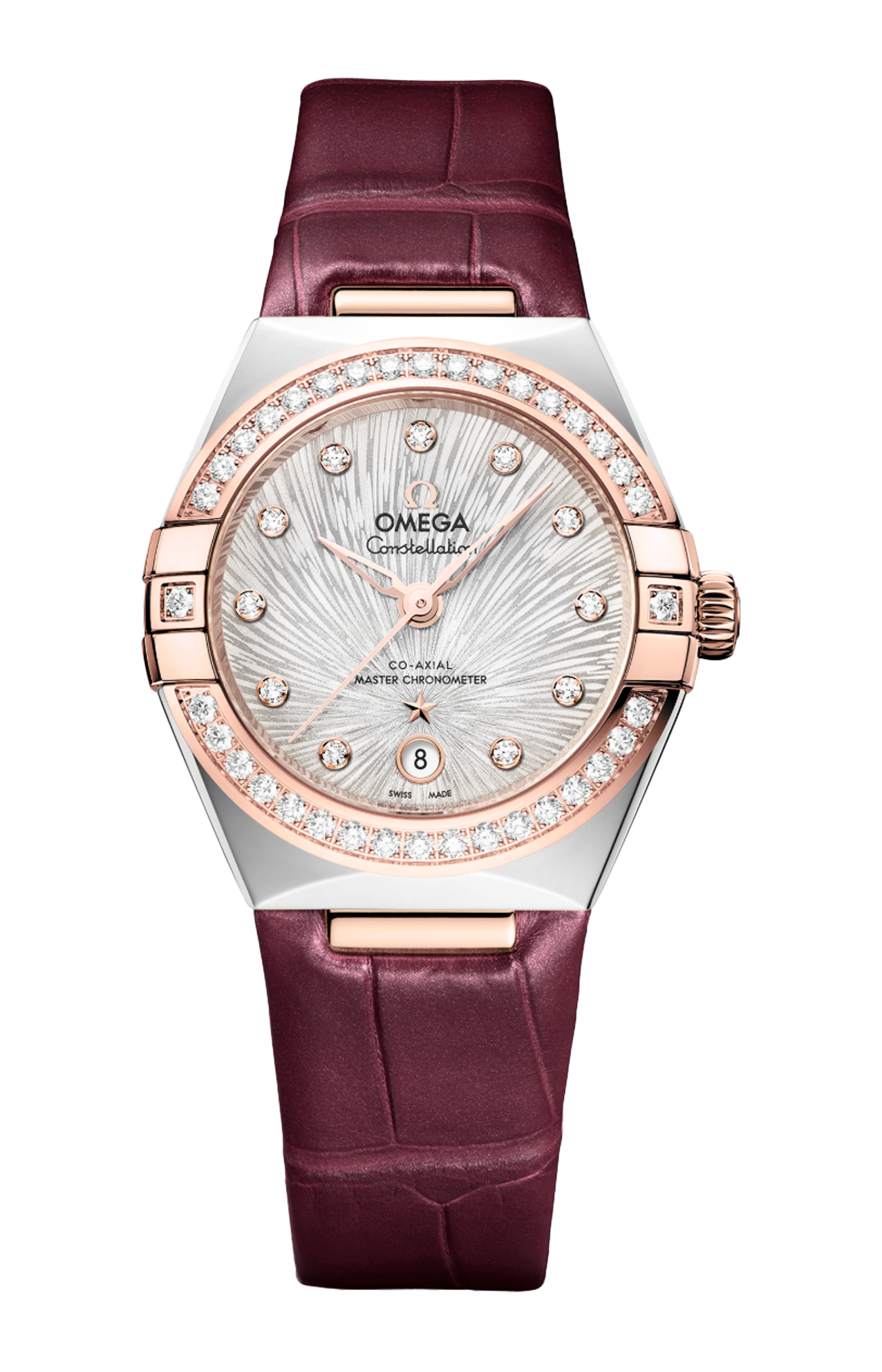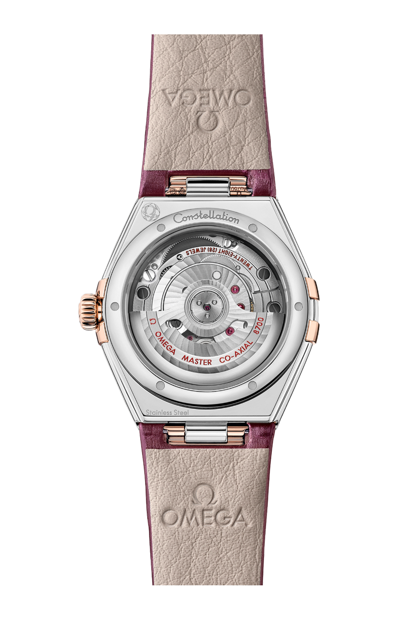 L'orologio, corredato da un cinturino in pelle Bordeaux scintillante, è animato dal calibro Omega Co-Axial Master Chronometer 8700, visibile attraverso il fondello in vetro zaffiro.