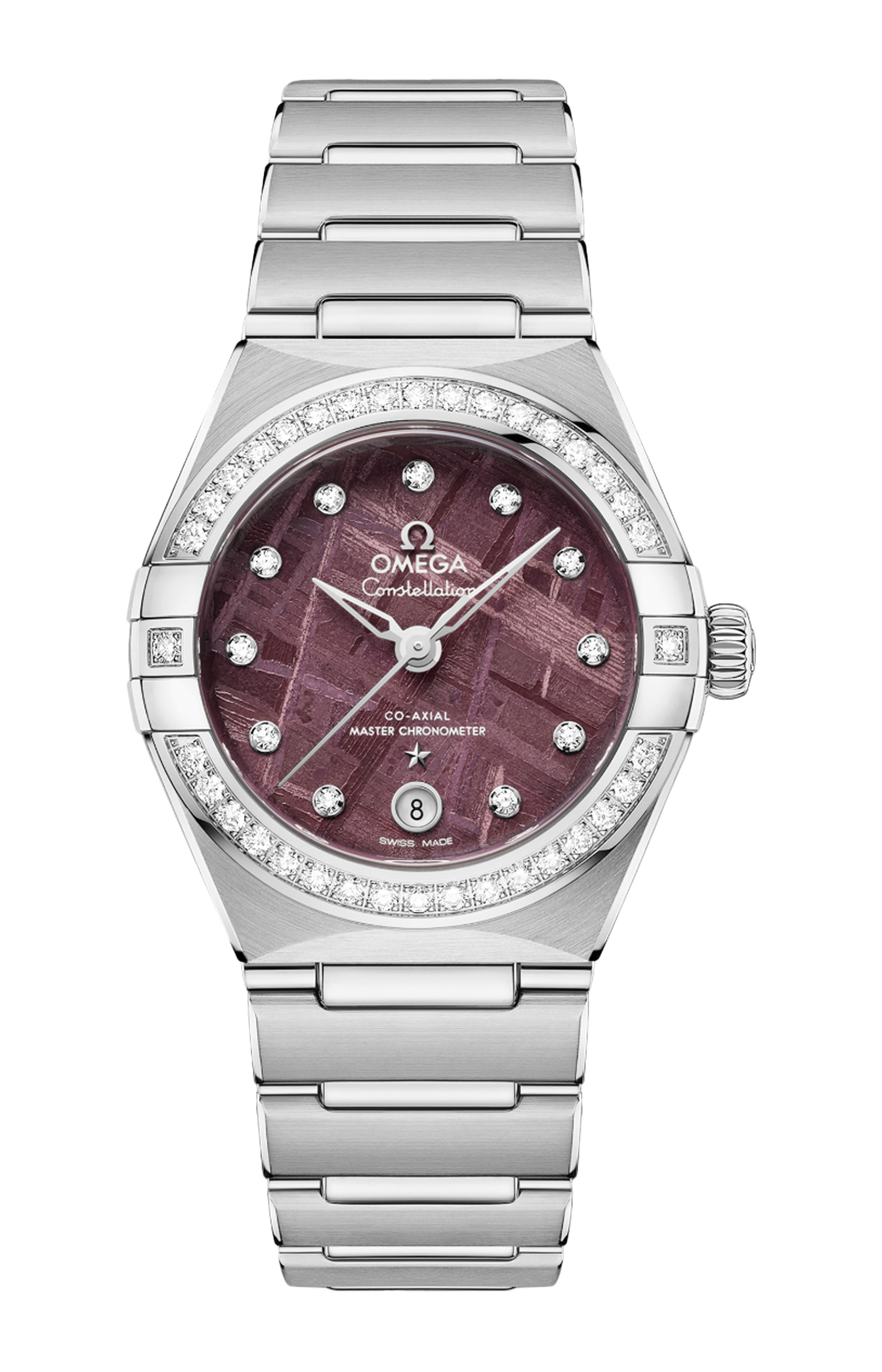 Il meraviglioso quadrante è realizzato a partire da un vero frammento di meteorite di ferro, sottoposto a trattamento in PVD viola. Il motivo naturale interno al meteorite è unico per ogni modello, elemento che ne garantisce l'unicità. Completano il design dell’orologio un datario a finestrella a ore 6, gli indici delle ore con diamanti e le lancette e la stella Constellation in oro bianco 18K.