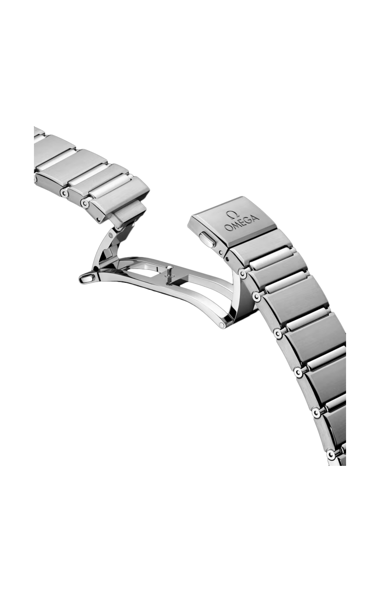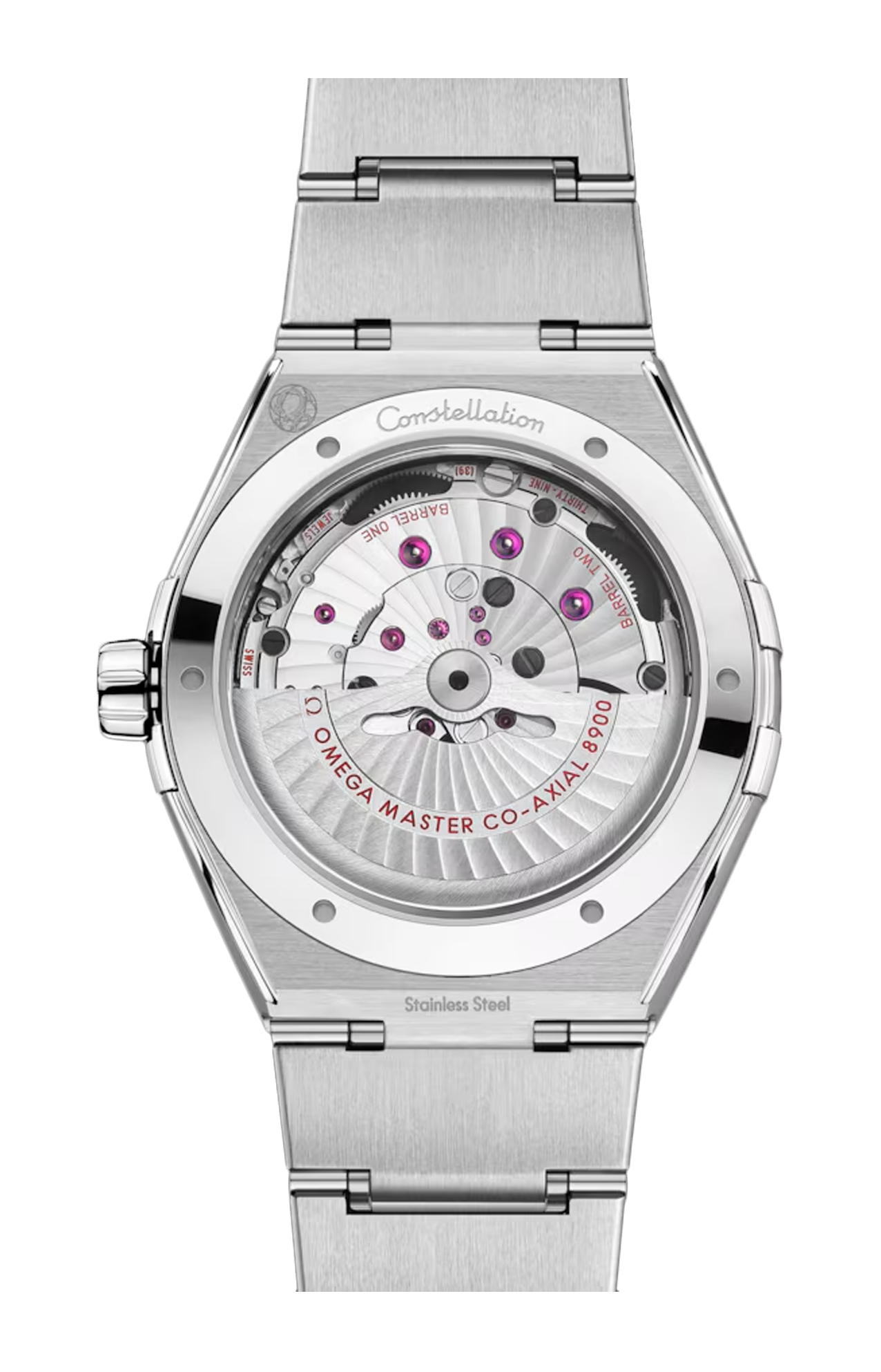 Corredato di un bracciale in acciaio inossidabile, il segnatempo batte al ritmo del calibro Omega Co-Axial Master Chronometer 8900, visibile attraverso il vetro zaffiro bombato resistente ai graffi.