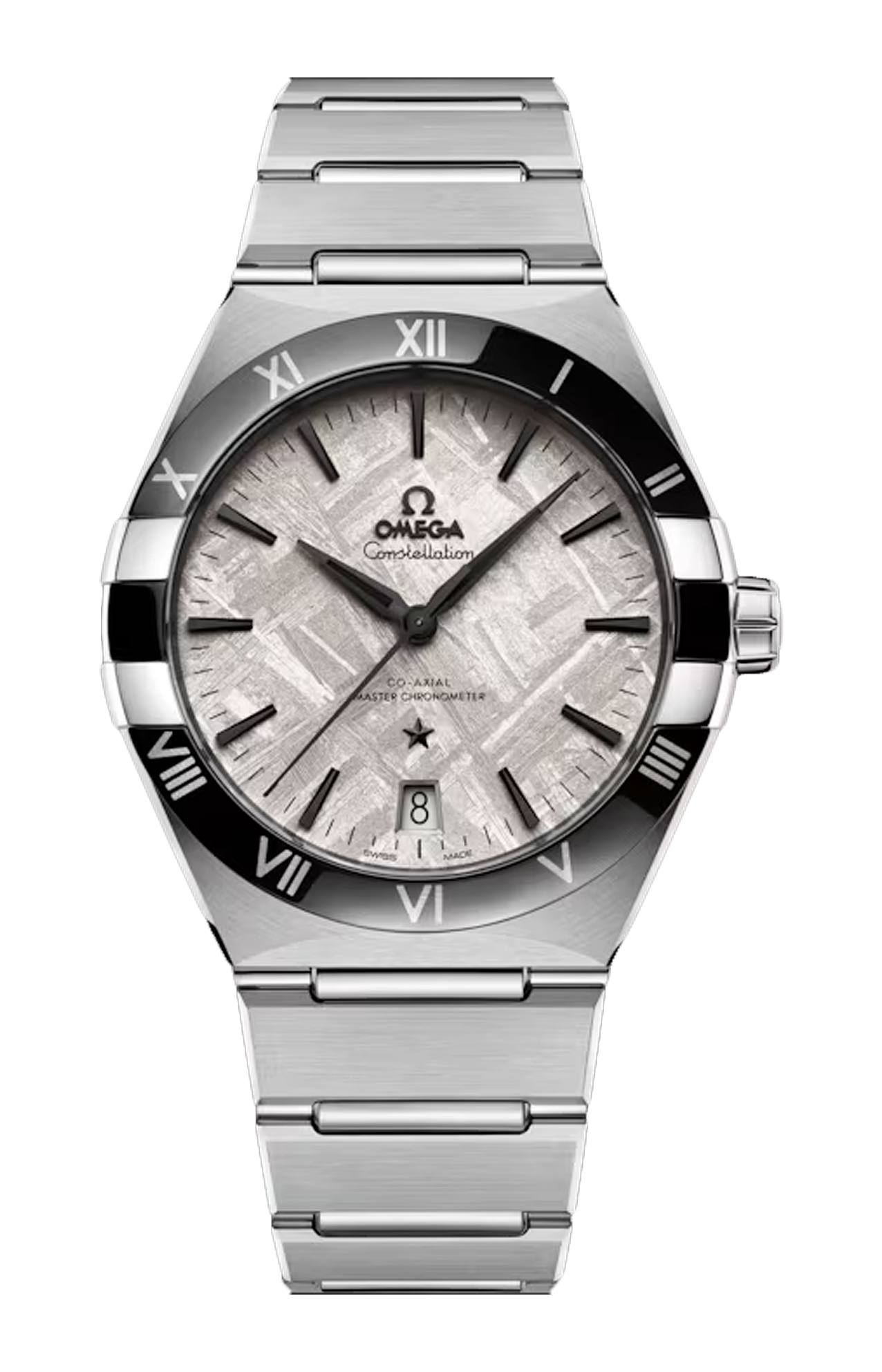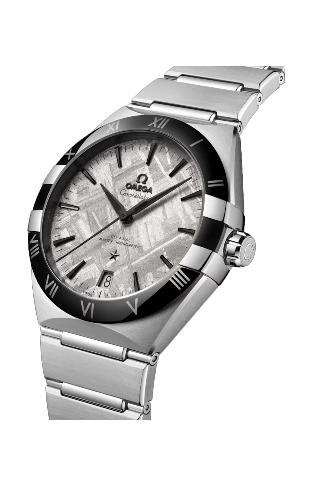 Il meraviglioso quadrante è realizzato a partire da un vero frammento di meteorite di ferro, sottoposto a trattamento galvanico grigio-rodiato. Il motivo naturale interno al meteorite è unico per ogni modello, elemento che ne garantisce l'unicità. Completano il design dell’orologio un datario a finestrella a ore 6 e gli indici, le lancette e la stella Constellation trattati in PVD nero.