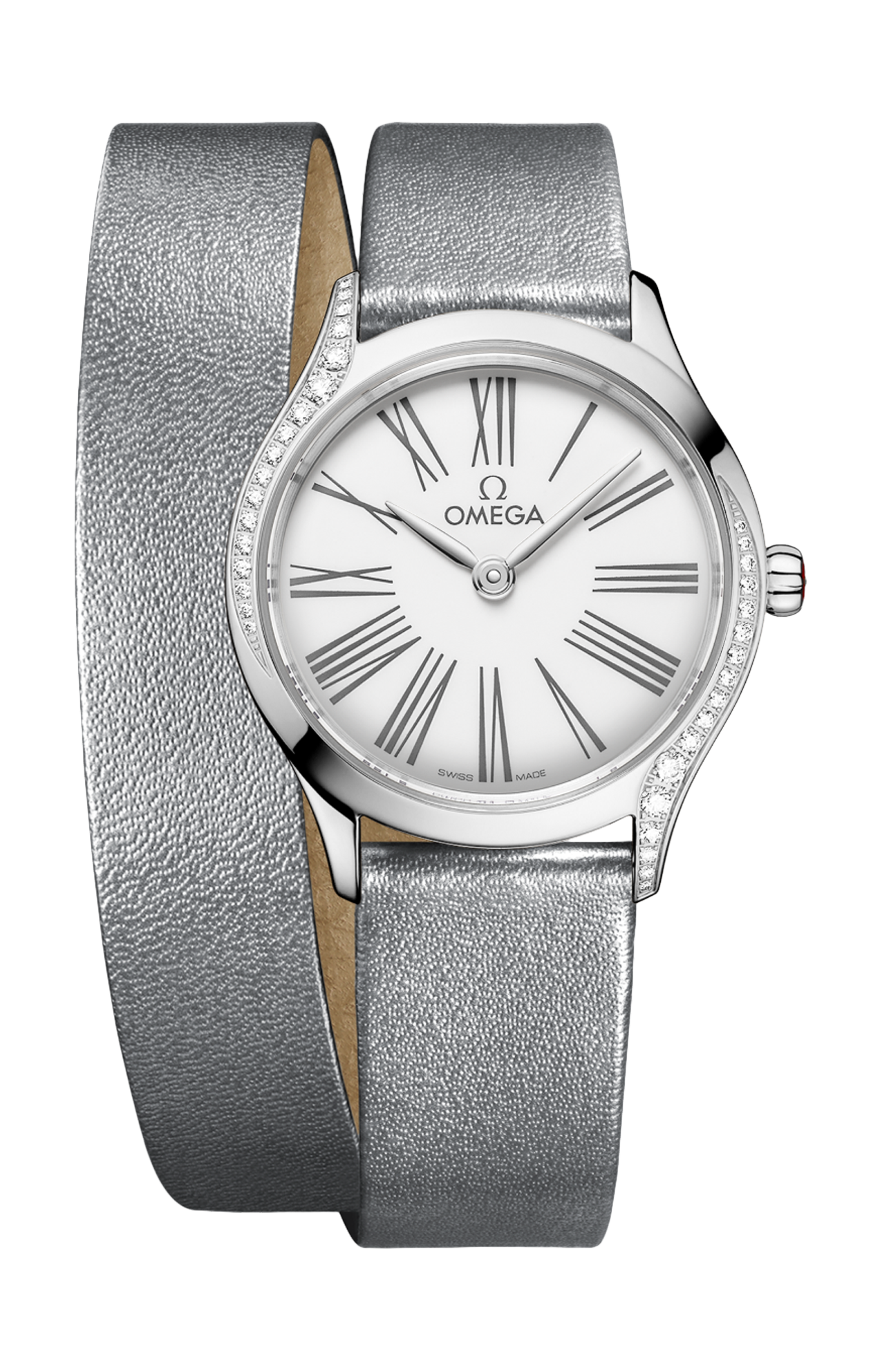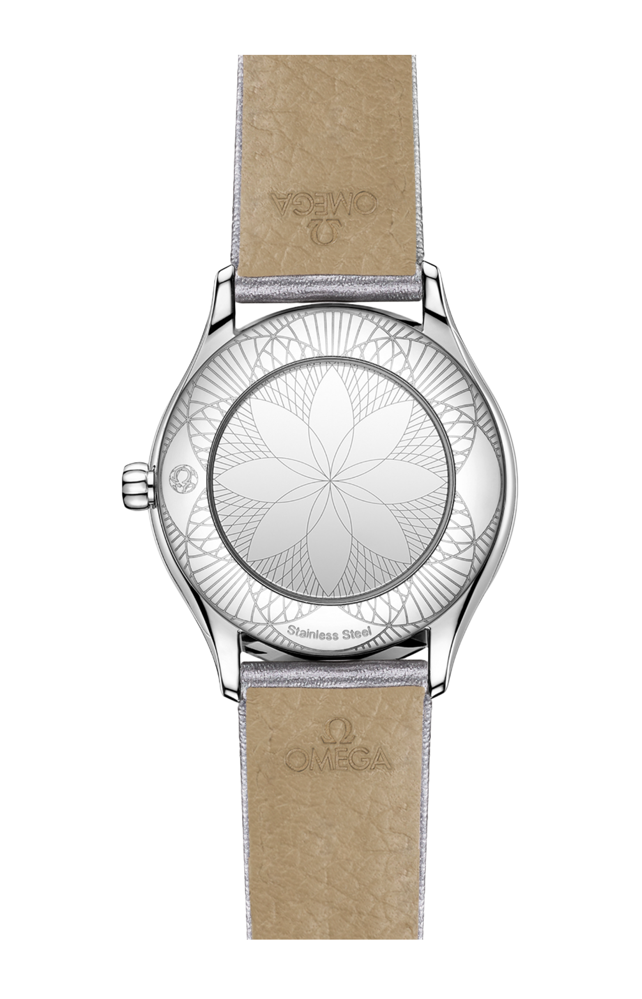 Corredato da un cinturino a doppio giro in pelle grigia scintillante con fibbia Trésor, l’orologio è animato dal calibro Omega 4061, alloggiato nello speciale fondello a specchio con motivo metallizzato “Her Time”.