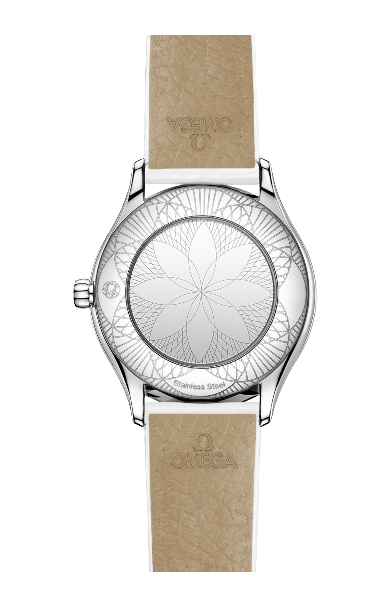 Corredato da un cinturino a doppio giro in pelle di vitello laccata bianca con trapuntatura a diamante, l’orologio è animato dal calibro Omega 4061, alloggiato nello speciale fondello a specchio con motivo metallizzato “Her Time”.
