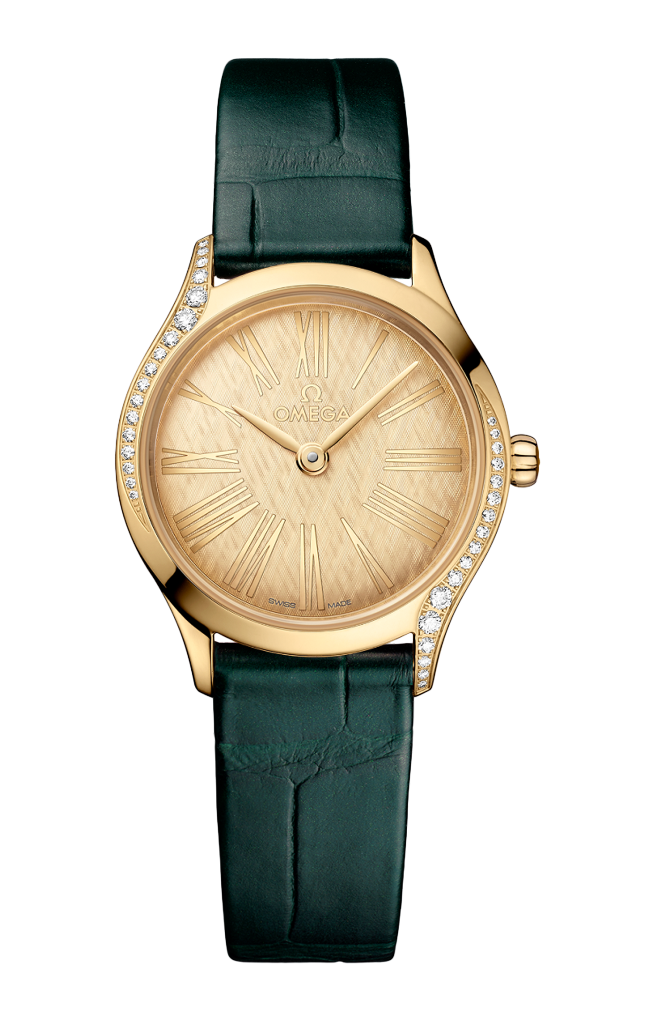 Corredato da un cinturino in pelle di alligatore verde scintillante con fibbia Trésor, l’orologio è animato dal calibro Omega 4061, alloggiato nello speciale fondello a specchio con motivo metallizzato “Her Time”.