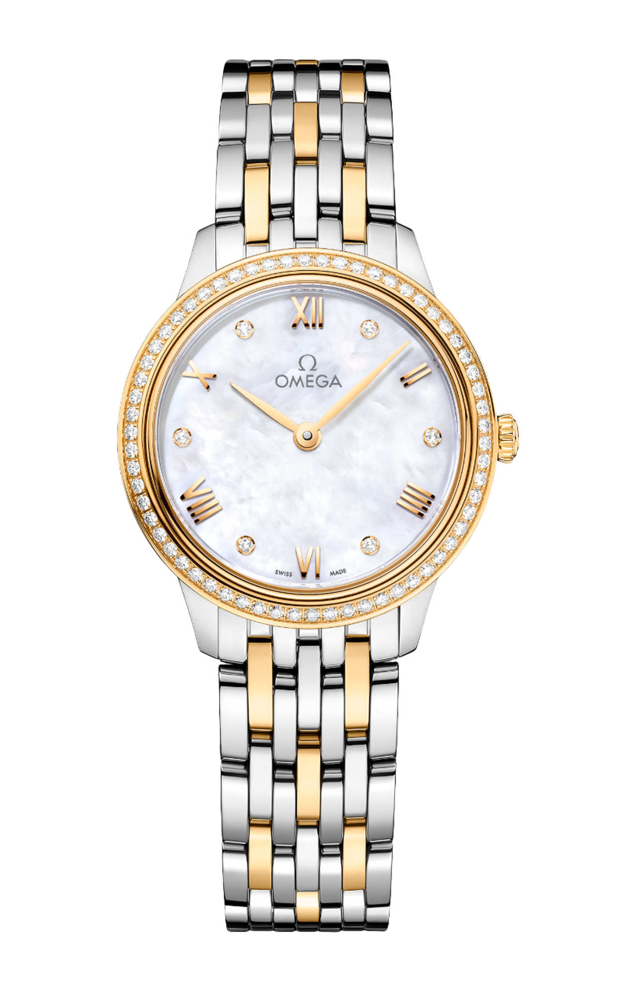 Questo modello da 27,5 mm in acciaio inossidabile e oro giallo 18K presenta una lunetta con pavé di diamanti e un quadrante in madreperla bianca. Il modello presenta lancette placcate in oro giallo, numeri romani e indici in diamante alternati. Il design essenziale di questo orologio è completato dal fondello pieno con medaglione del dio Crono goffrato.