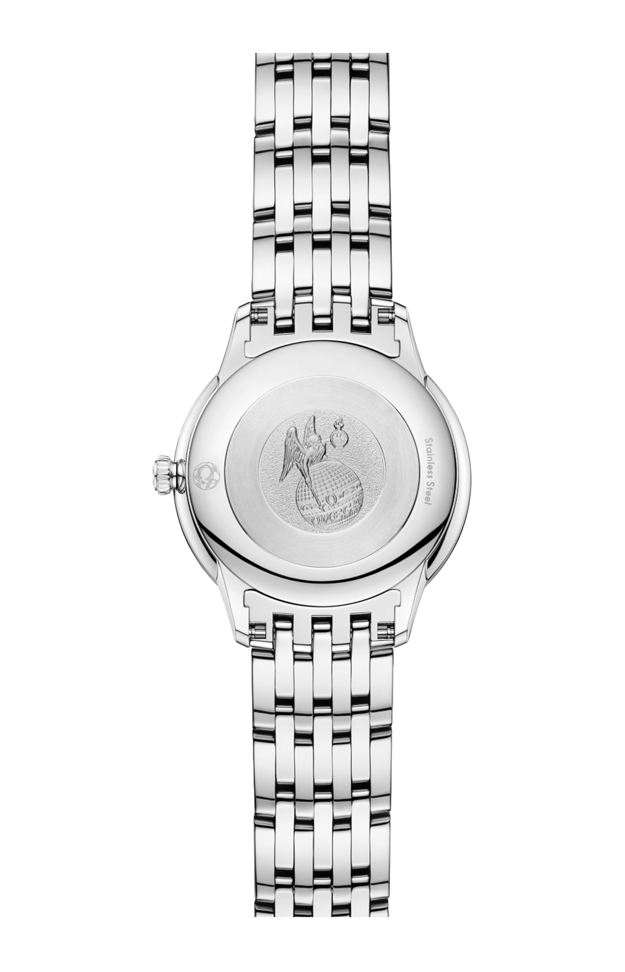 Questo modello da 27,5 mm in acciaio inossidabile presenta una lunetta con pavé di diamanti e un quadrante in madreperla bianca. Le lancette presentano un trattamento PVD color oro Sedna™, mentre i numeri romani e gli indici in diamante alternati sono incastonati in supporti in oro Sedna™ 18K. Il design essenziale di questo orologio è completato dal fondello pieno con medaglione del dio Crono goffrato.