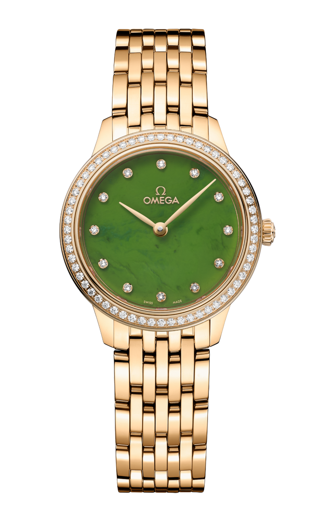 In questo modello con cassa da 27,5 mm in oro giallo 18K e lunetta tempestata di diamanti, il quadrante è realizzato in una splendida giada verde e vanta lancette in oro giallo 18K e 12 indici delle ore con diamanti. Reso unico dal quadrante con pietre preziose, questo orologio gioiello è dotato di un fondello pieno con medaglione del dio Crono goffrato.