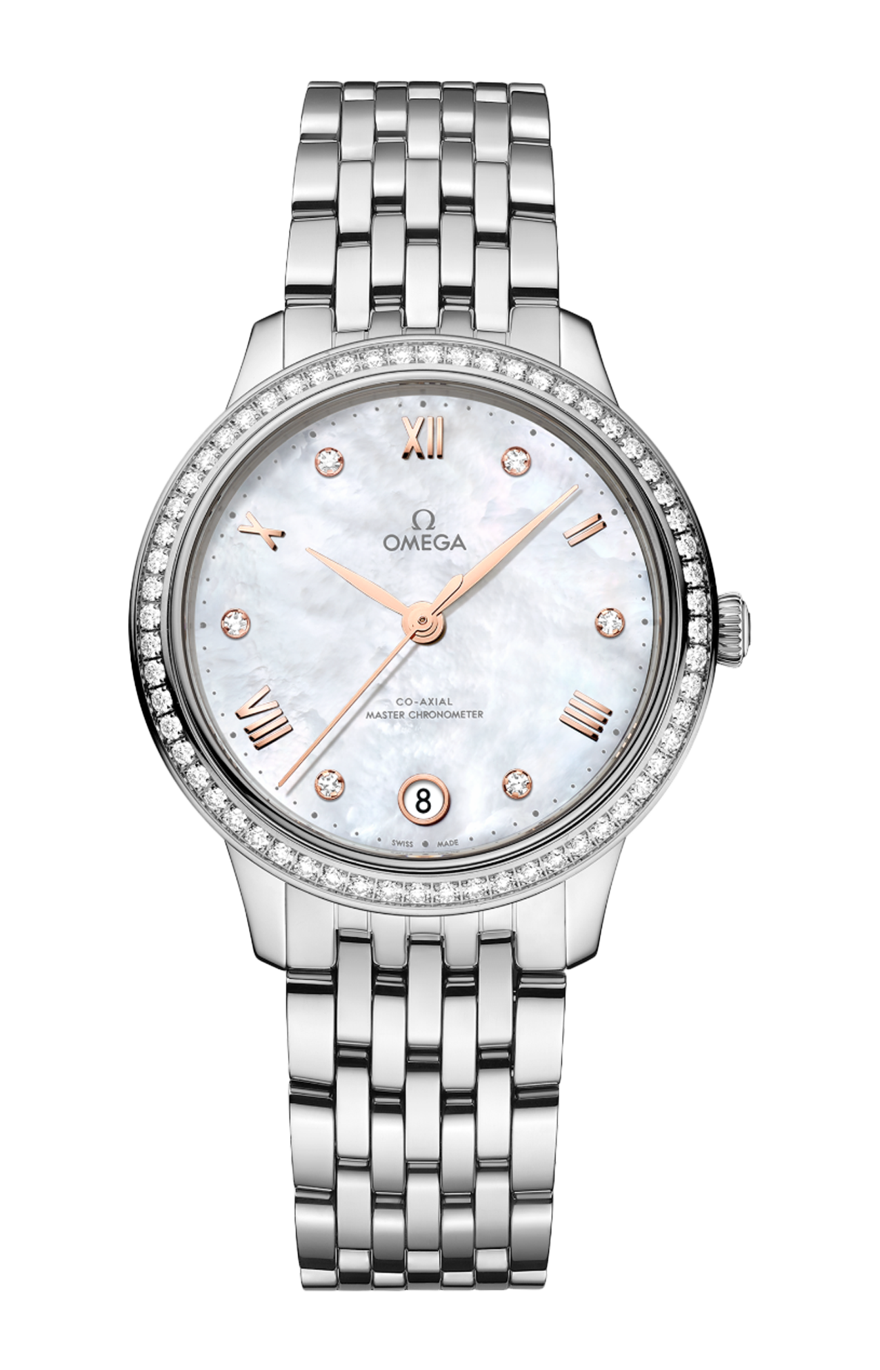 Questo modello da 34 mm in acciaio inossidabile presenta una lunetta con pavé di diamanti e un quadrante in madreperla bianca. Le lancette presentano un trattamento PVD color oro Sedna™, mentre i numeri romani e gli indici in diamante alternati sono incastonati in supporti in oro Sedna™ 18K.
