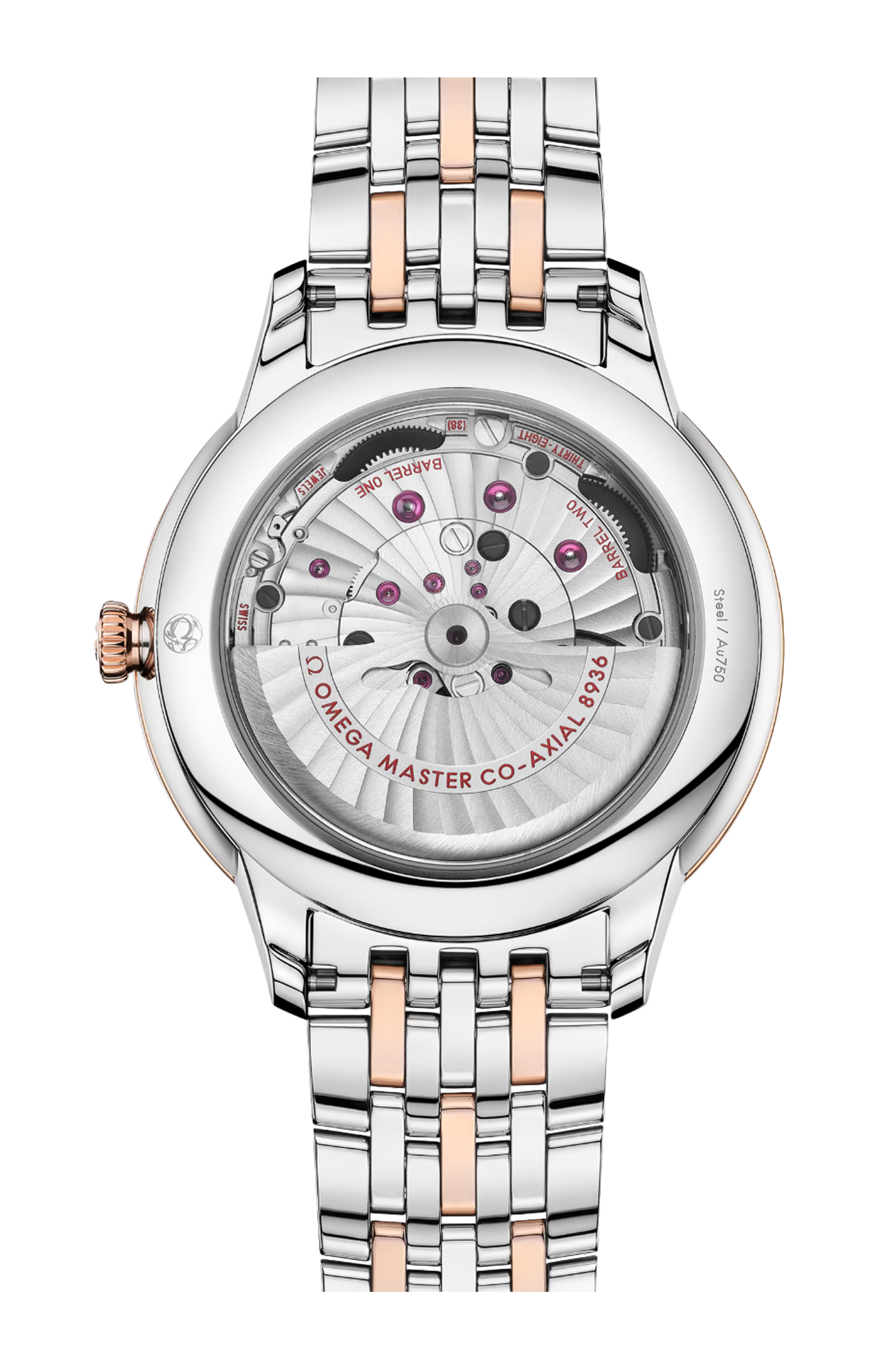 Corredato da un bracciale in acciaio inossidabile e oro Sedna™ 18K, questo de Ville Prestige è animato dal calibro Co-Axial Master Chronometer 8936, visibile attraverso il fondello in vetro zaffiro.