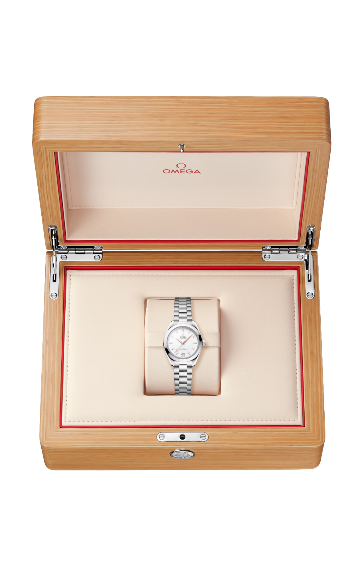 L’orologio è corredato da un bracciale integrato in acciaio inossidabile dotato di splendide maglie rotonde lucide e spazzolate, fibbia déployante con chiusura a farfalla e comodo sistema di regolazione Omega.