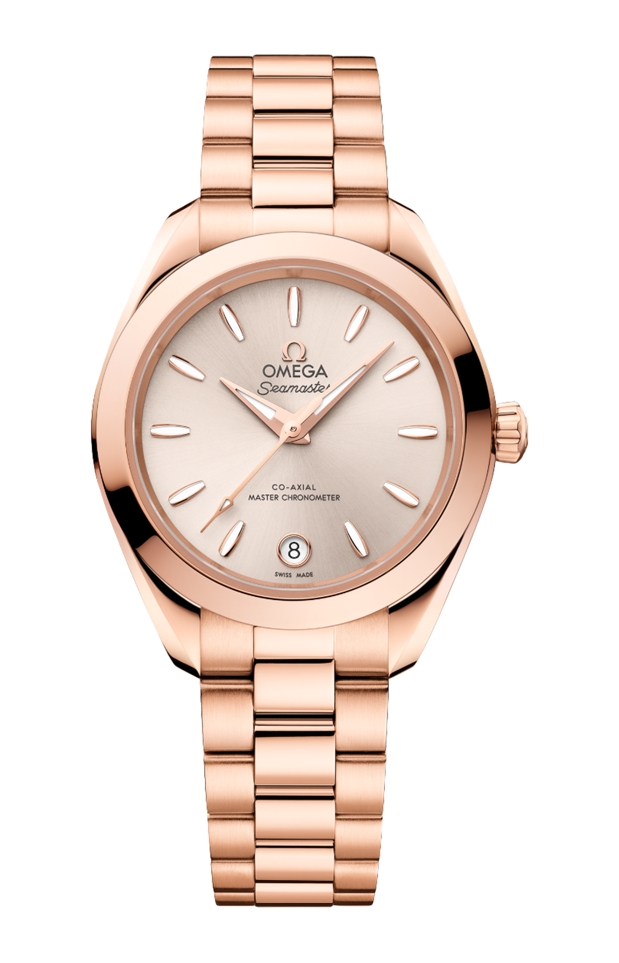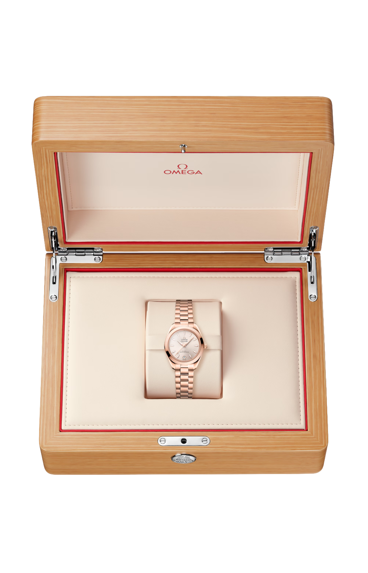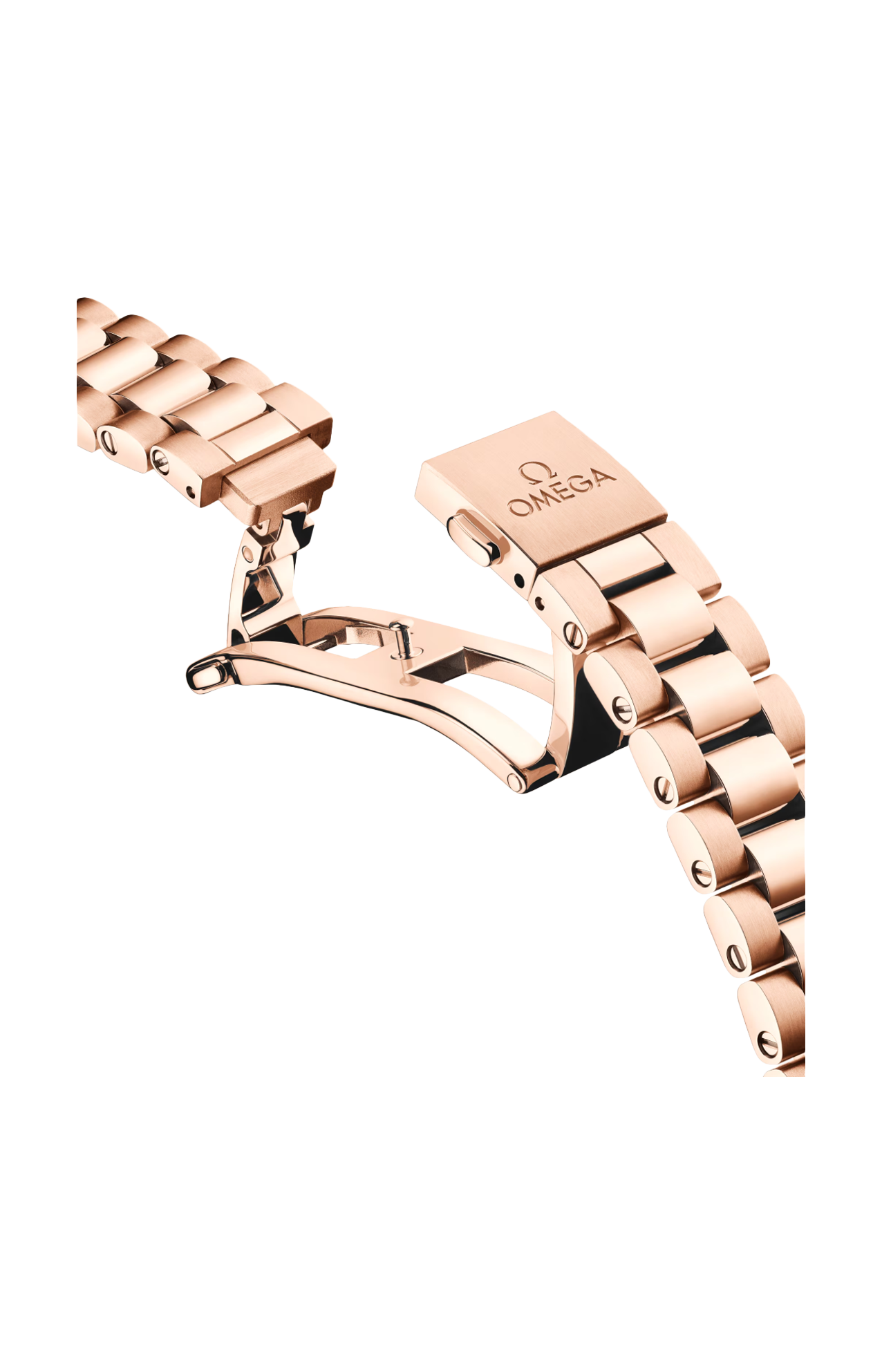 L’orologio è corredato da un bracciale integrato in Oro Sedna™ 18K dotato di splendide maglie rotonde lucide e spazzolate, fibbia déployante con chiusura a farfalla e comodo sistema di regolazione Omega.