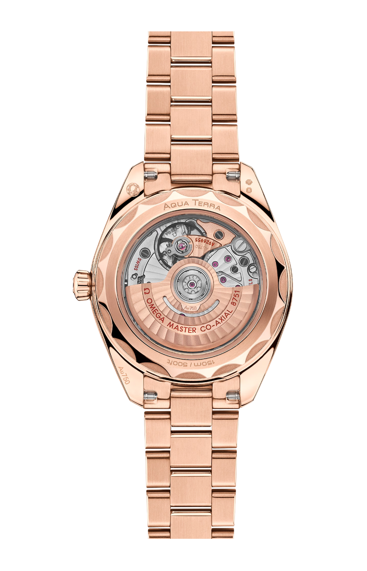 La cassa simmetrica lucida in Oro Sedna™ 18K presenta un fondello a vite con bordo ondulato.