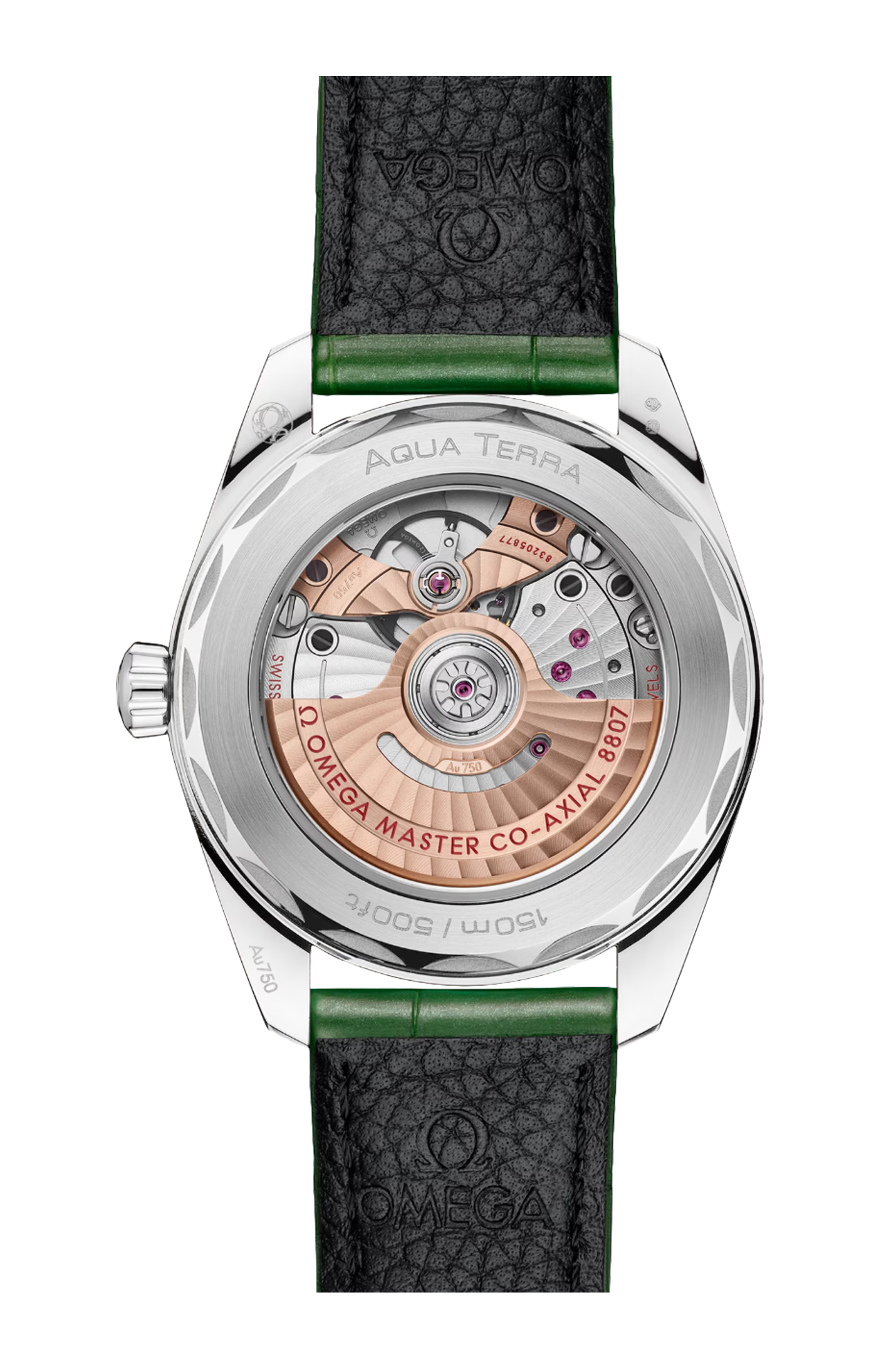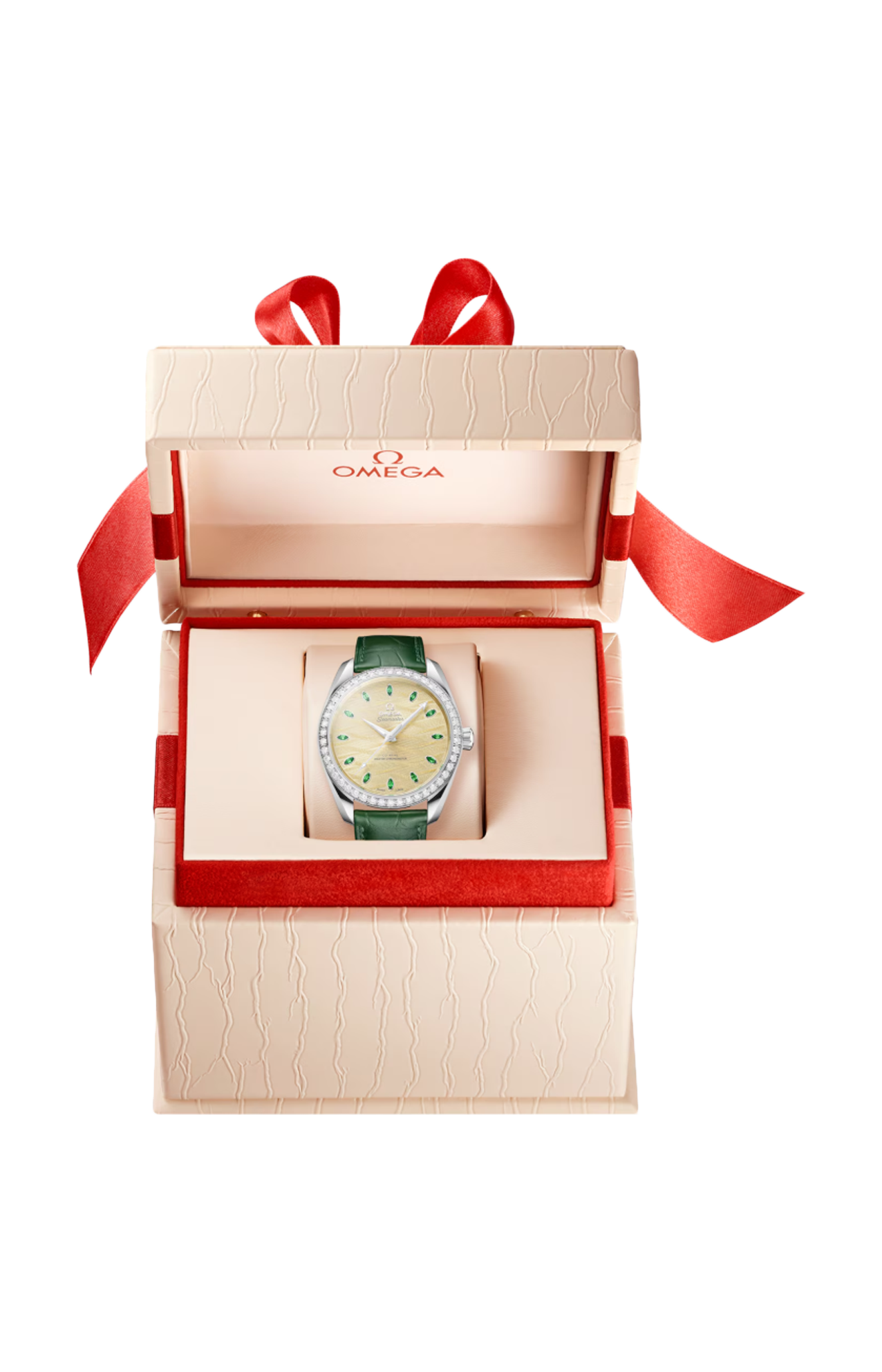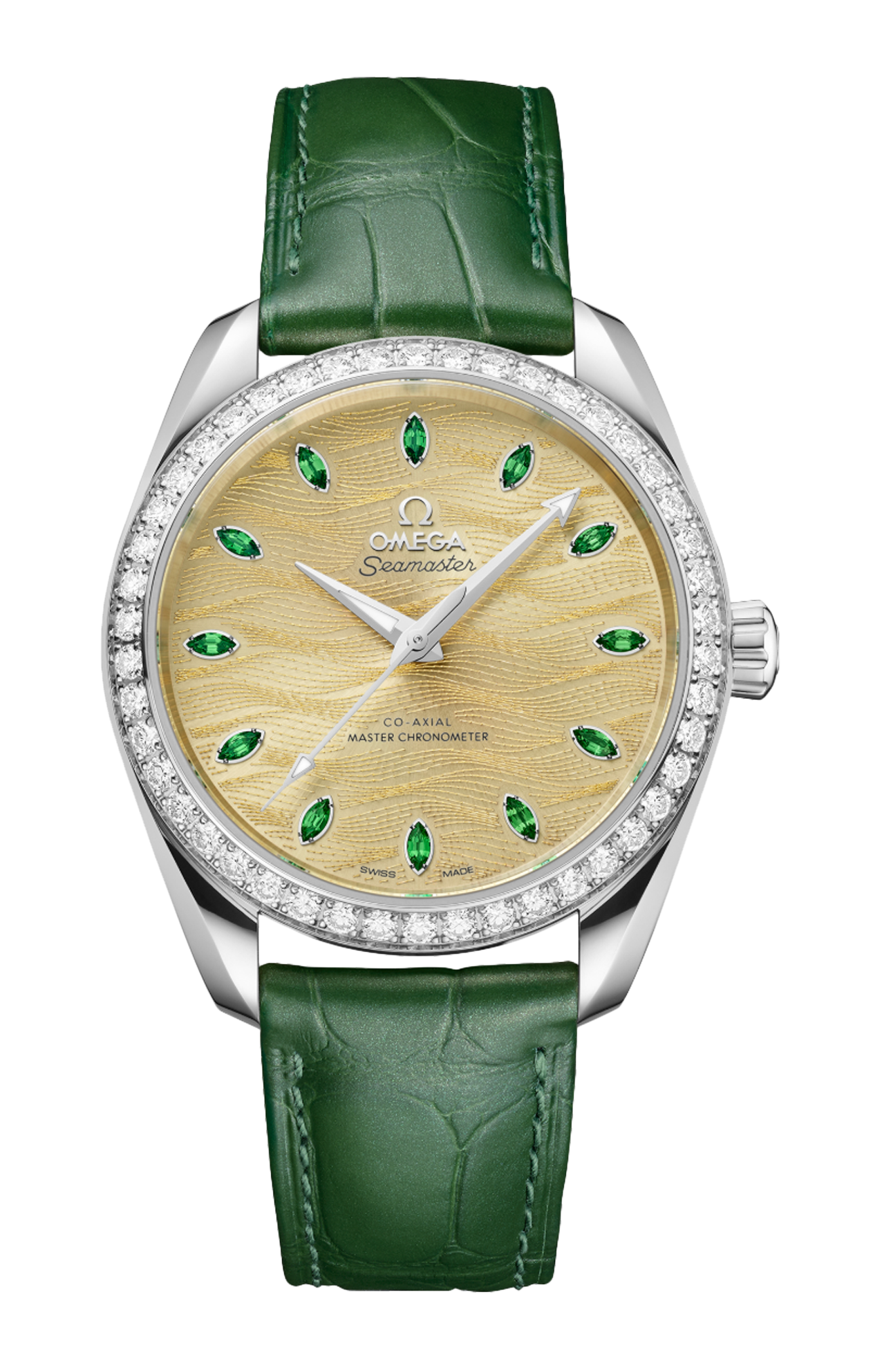 Corredato da un cinturino in pelle scintillante verde, il segnatempo è animato dal calibro Omega Co-Axial Master Chronometer 8807, certificato dall’Istituto Federale Svizzero di Metrologia (METAS) secondo i più elevati standard stabiliti dal settore orologiero.