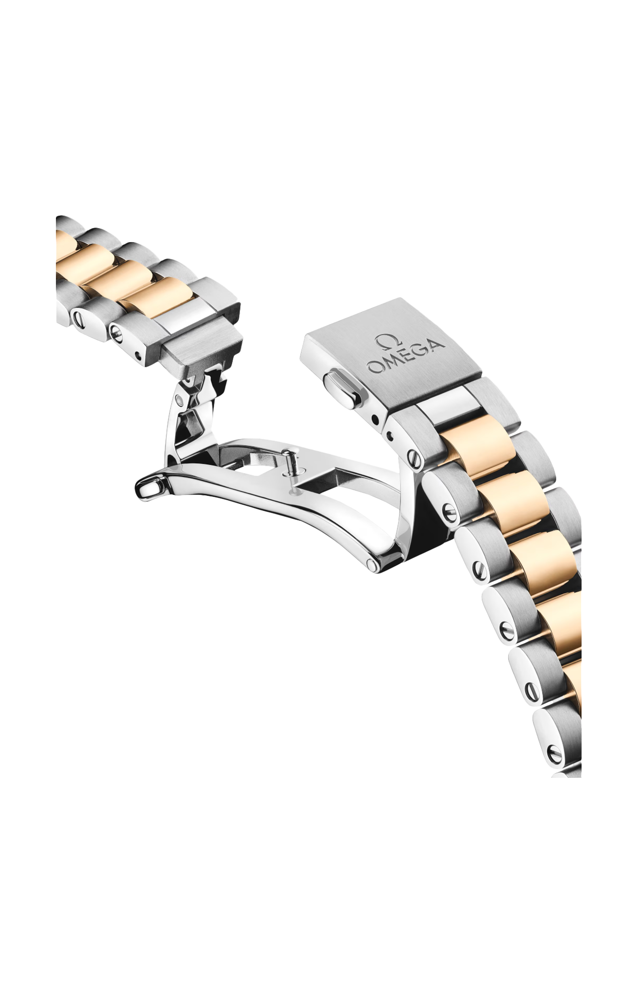 L’orologio è corredato da un bracciale integrato con maglie centrali lucide e maglie esterne spazzolate ed è animato dal calibro Omega Co-Axial Master Chronometer 8900, certificato dall’Istituto Federale Svizzero di Metrologia (METAS) secondo i più elevati standard stabiliti dal settore orologiero.