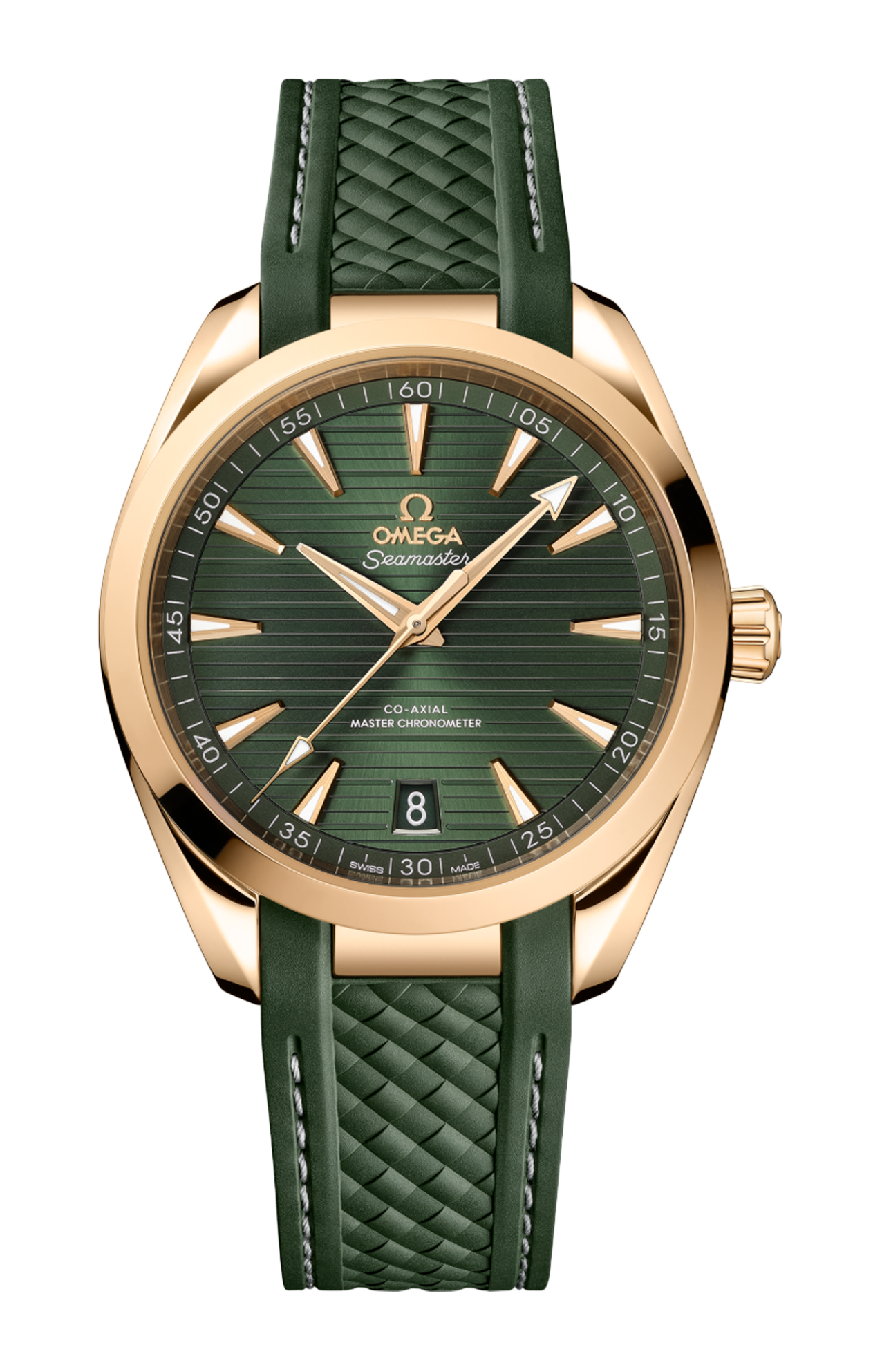 L’orologio è corredato da un cinturino integrato in caucciù strutturato verde con impunture grigie, fissato con una fibbia déployante in oro Moonshine™ 18K.