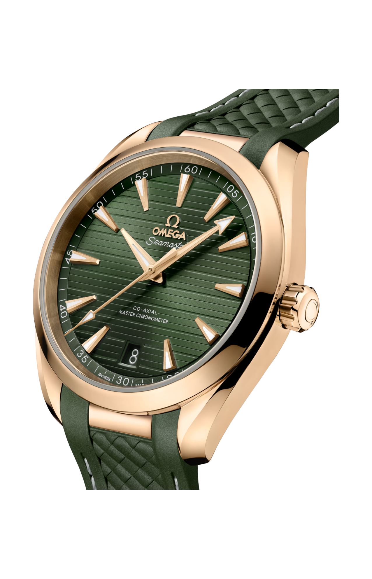 Il quadrante in PVD verde, completato da un motivo teak orizzontale ispirato ai ponti in legno delle imbarcazioni di lusso, presenta un datario a finestrella a ore 6, lancette diamantate lucide e indici diamantati e spazzolati in oro Moonshine™ 18K riempiti di Super-Luminova bianca.
