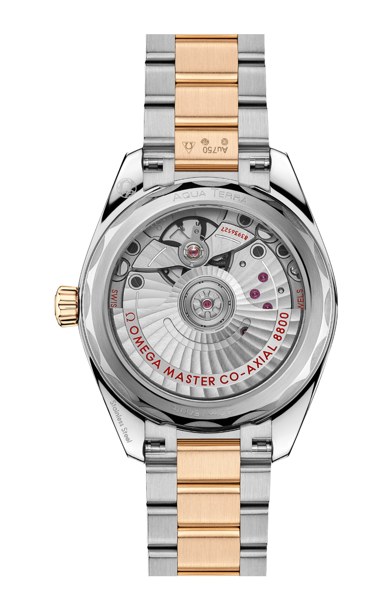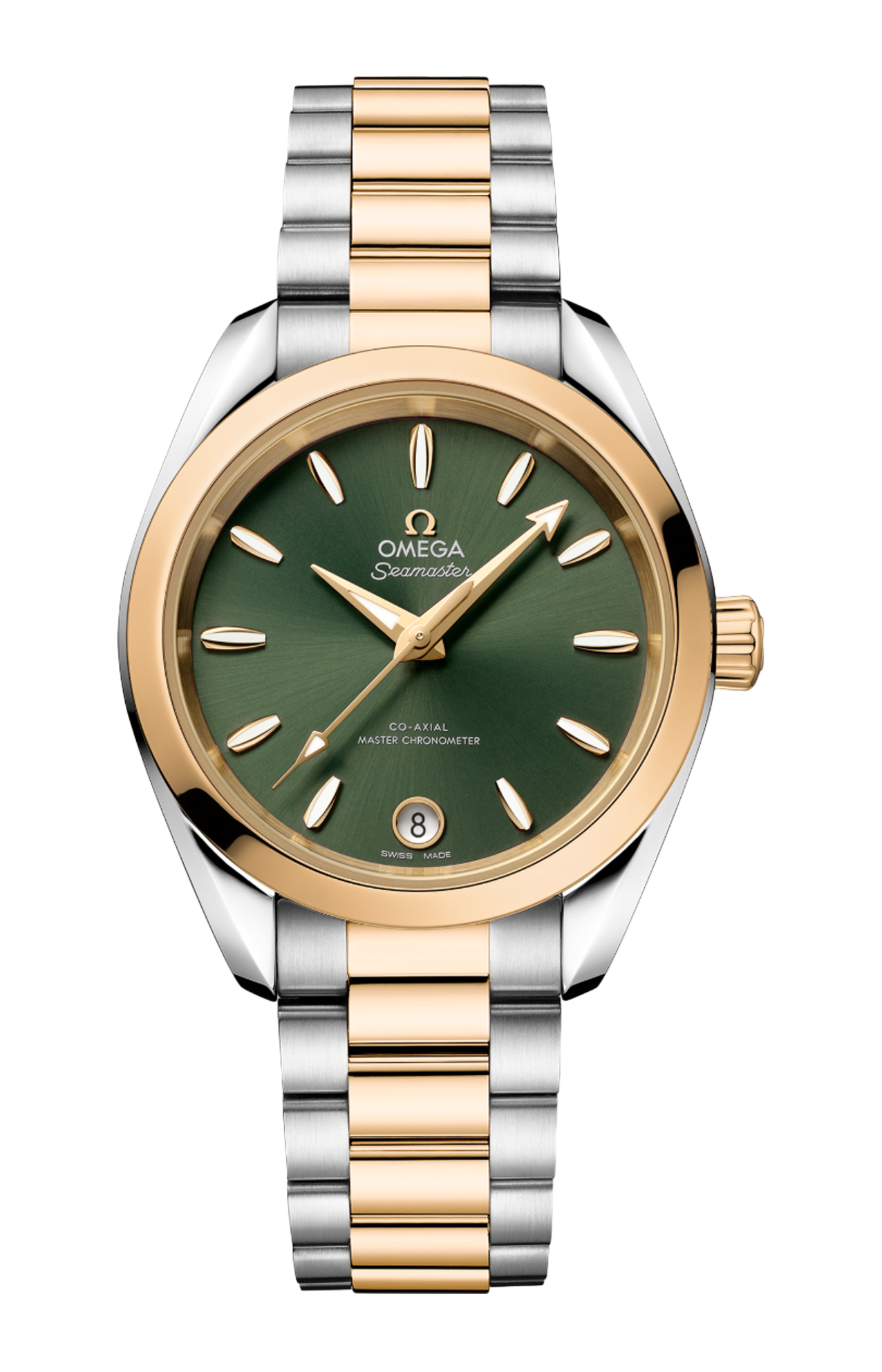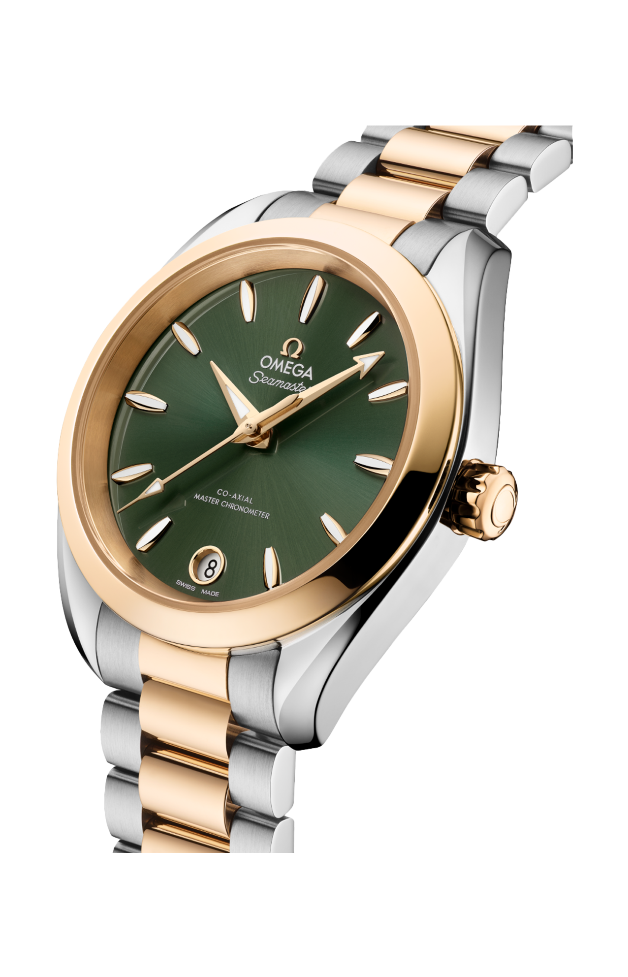 Il Seamaster Aqua Terra è un eccezionale tributo alla ricca tradizione marittima di Omega. Il modello da 34 mm presenta una cassa simmetrica in acciaio inossidabile e oro Moonshine™ 18K con fondello a vite e design con bordo ondulato.