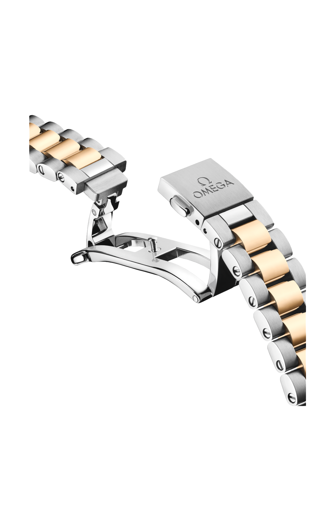L’orologio è corredato da un bracciale integrato con maglie centrali lucide e maglie esterne spazzolate ed è animato dal calibro Omega Co-Axial Master Chronometer 8800, certificato dall’Istituto Federale Svizzero di Metrologia (METAS) secondo i più elevati standard stabiliti dal settore orologiero.