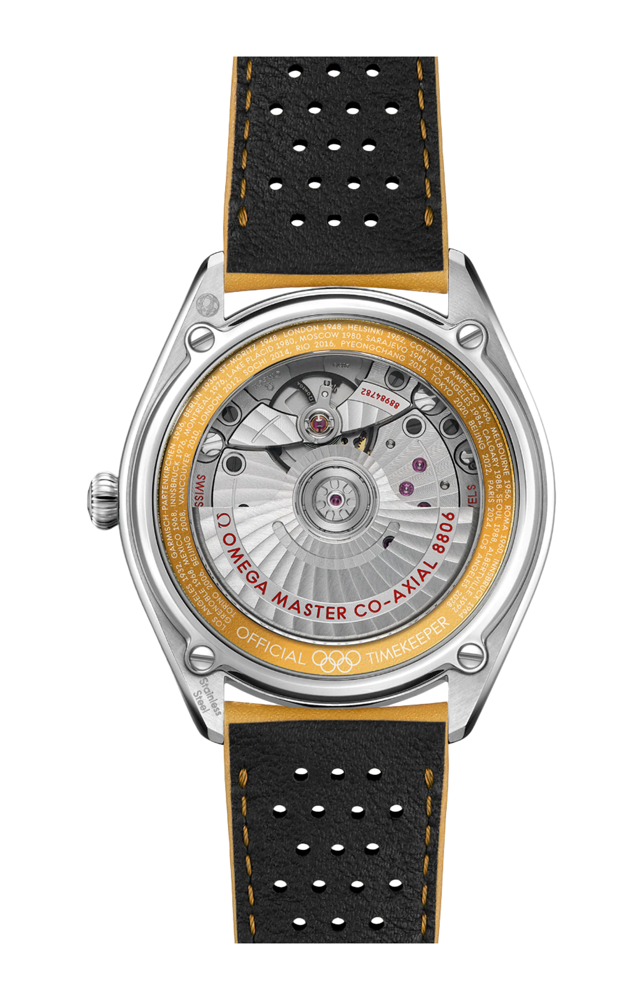 Il fondello presenta un anello in alluminio giallo anodizzato con tutte le città e le date in cui si sono svolti i Giochi Olimpici cronometati da Omega: da Los Angeles 1932 a Los Angeles 2028.