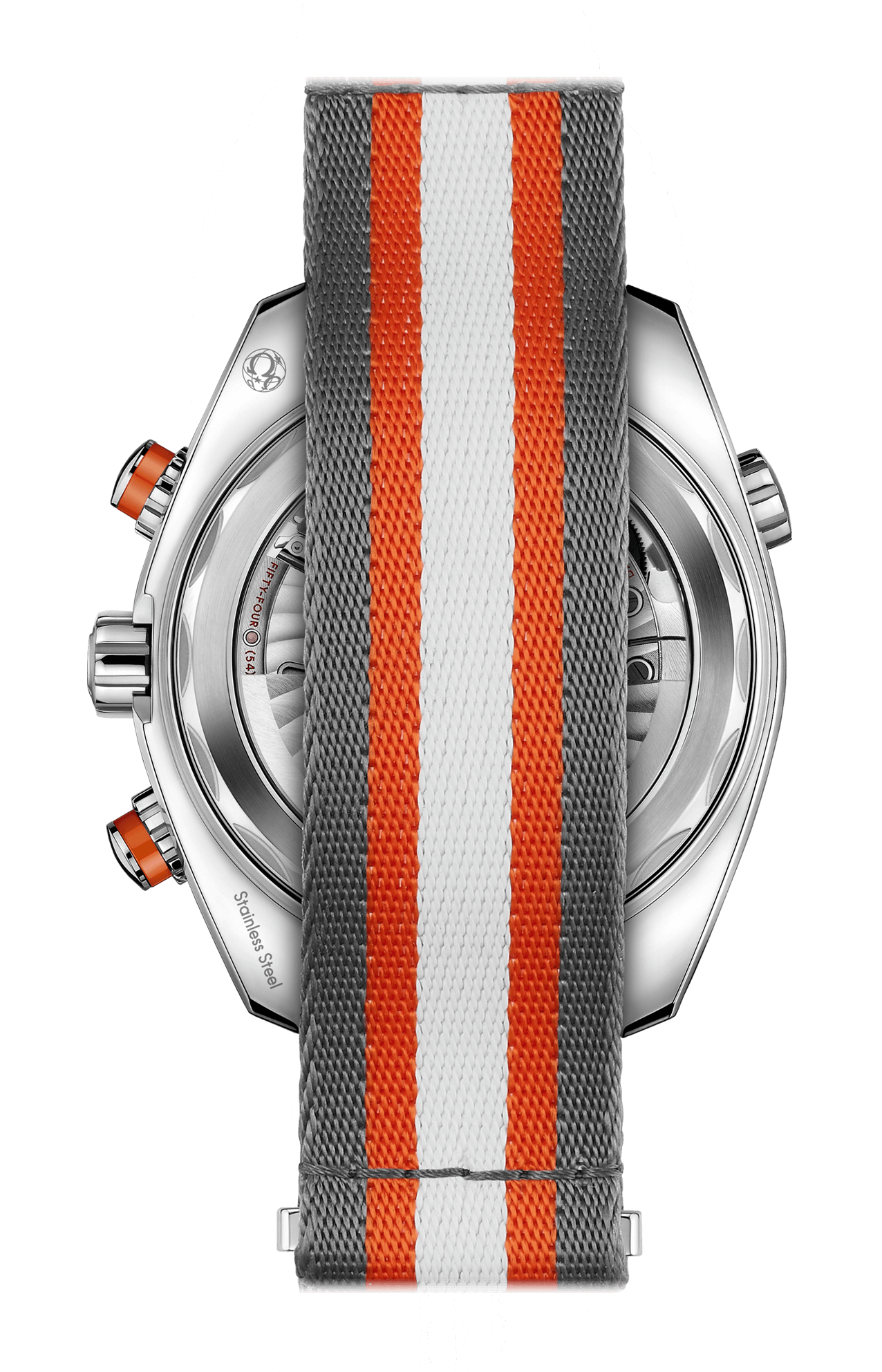 Tra le altre caratteristiche figurano un fondello a vite con motivo alveolare e un cinturino NATO in poliamide arancione, grigio e bianco con 5 strisce completo di fibbia lucida e passanti in acciaio inossidabile.