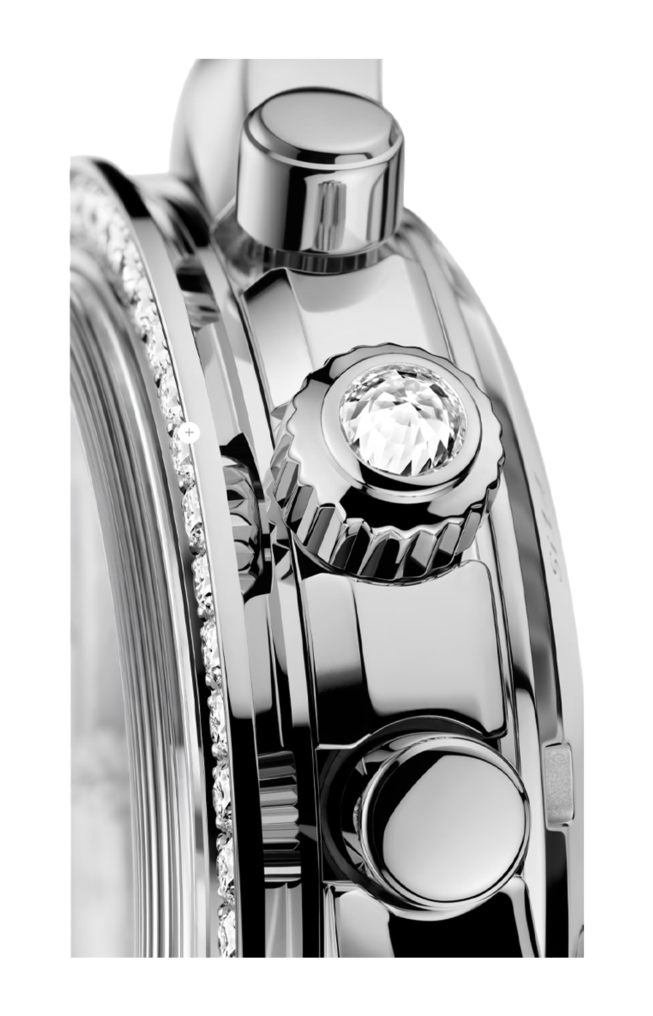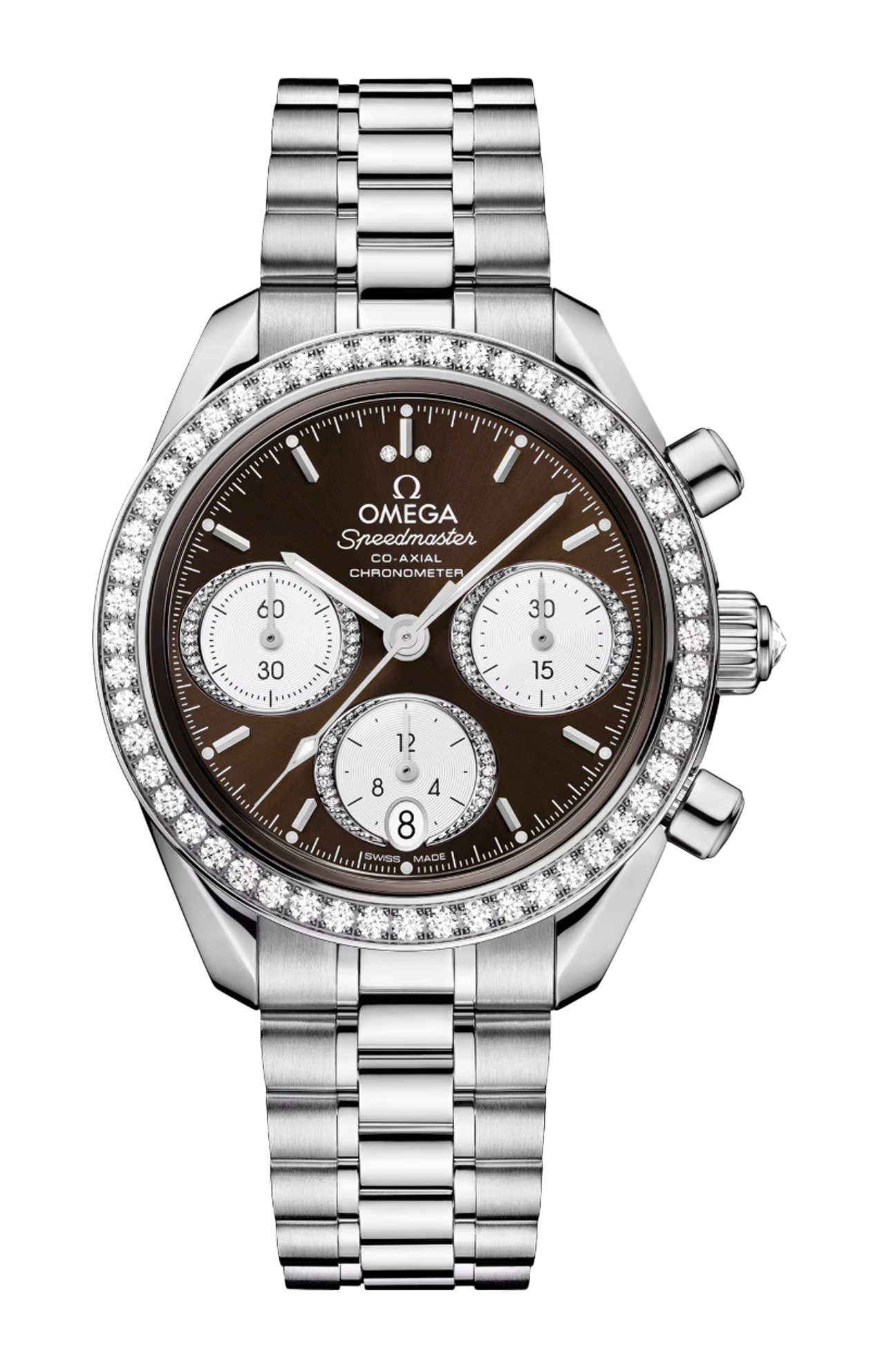 La collezione Speedmaster 38 mm è stata realizzata puntando su semplicità, dimensioni e colore, pur mantenendo il look e la tradizione distintivi del più celebre cronografo di Omega. Questo modello, dotato di cassa in acciaio inossidabile interamente lucido, presenta una lunetta con 52 diamanti e una corona lucida con un diamante.