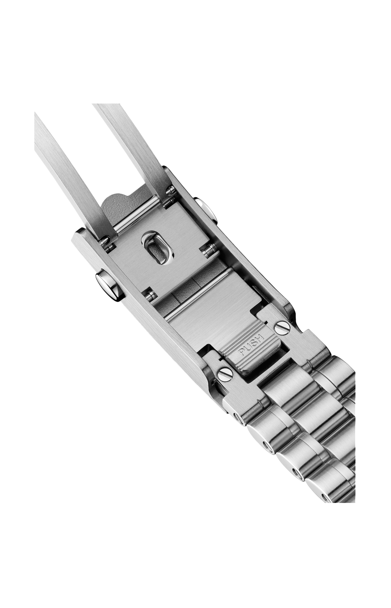 Il quadrante in PVD marrone comprende contatori ovali orizzontali con rivestimento argentato e un datario a finestrella ovale verticale a ore 6. Le lancette di ore e minuti, diamantate e rodiate lucide, sono riempite di Super-Luminova bianca che emette una luminescenza verde.