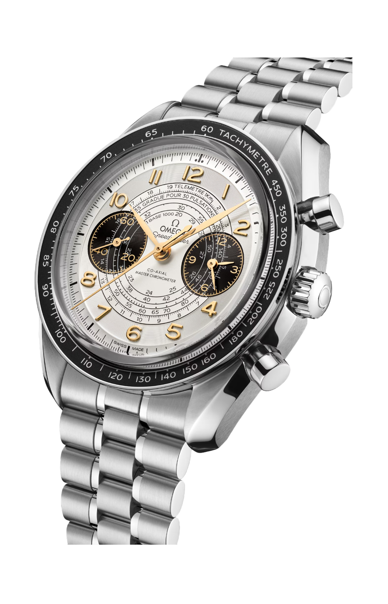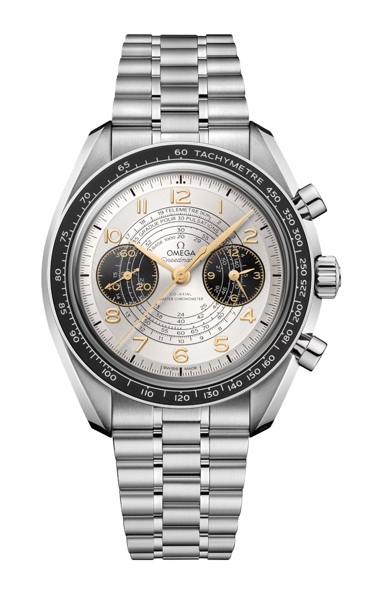 Corredato da un bracciale in acciaio inossidabile con il comodo sistema di regolazione brevettato Omega, l’orologio presenta un contatore dei piccoli secondi a ore 9 e contatori delle 12 ore e dei 60 minuti a ore 3. Il segnatempo è animato dal calibro Omega Co-Axial Master Chronometer 9908.