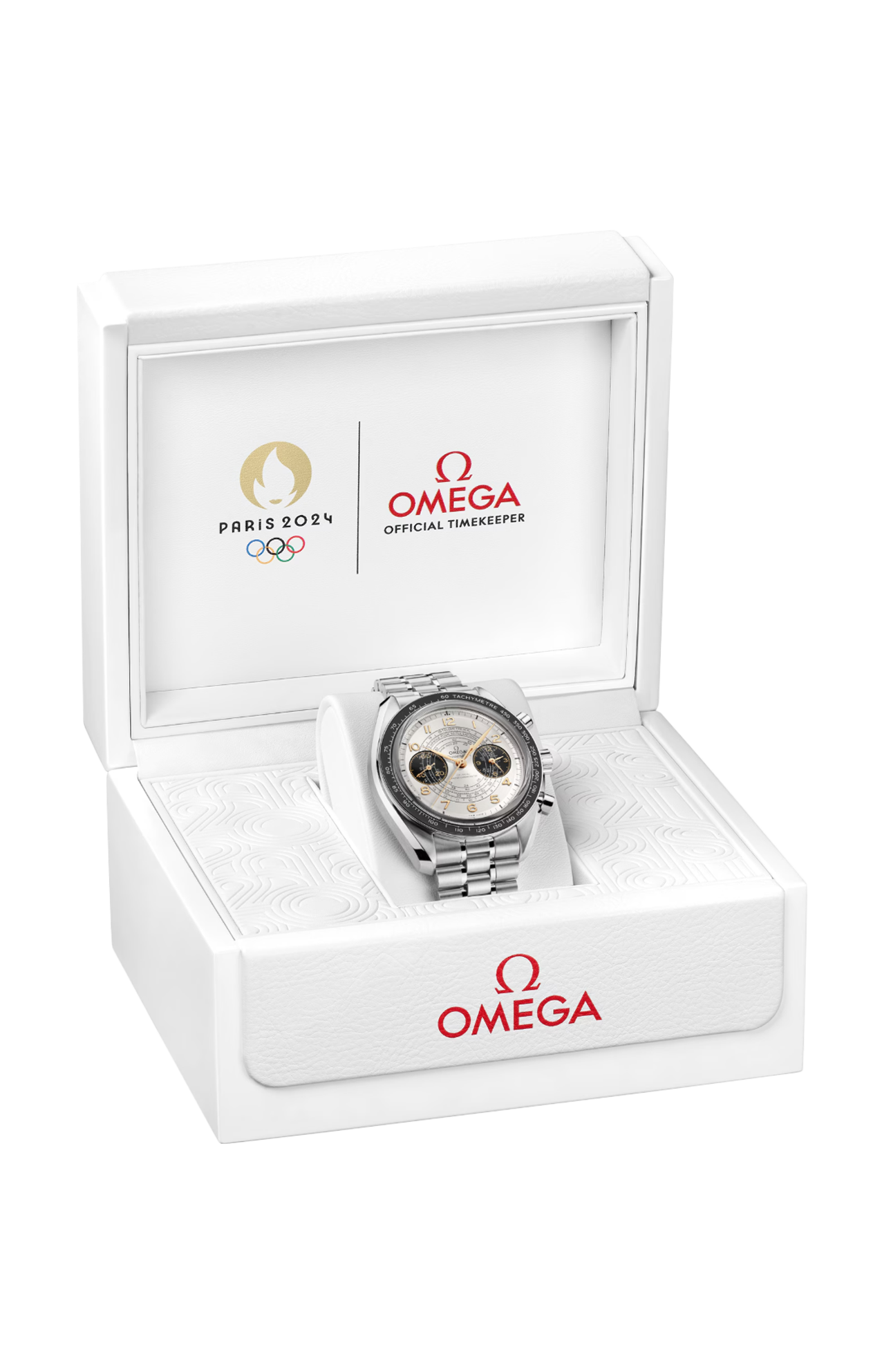 Questo modello da 43 mm è un omaggio alle Olimpiadi di Parigi 2024 e sfoggia i tre colori principali dell’evento: oro, nero e bianco. L’orologio è realizzato in acciaio inossidabile e presenta un quadrante bianco argentato opalino con contatori bruniti. Tra le caratteristiche aggiuntive si annoverano l’anello della lunetta in alluminio anodizzato nero con scala tachimetrica, i numeri arabi in oro Moonshine™ 18K e le lancette a foglia e dei contatori con trattamento in PVD oro Moonshine™.