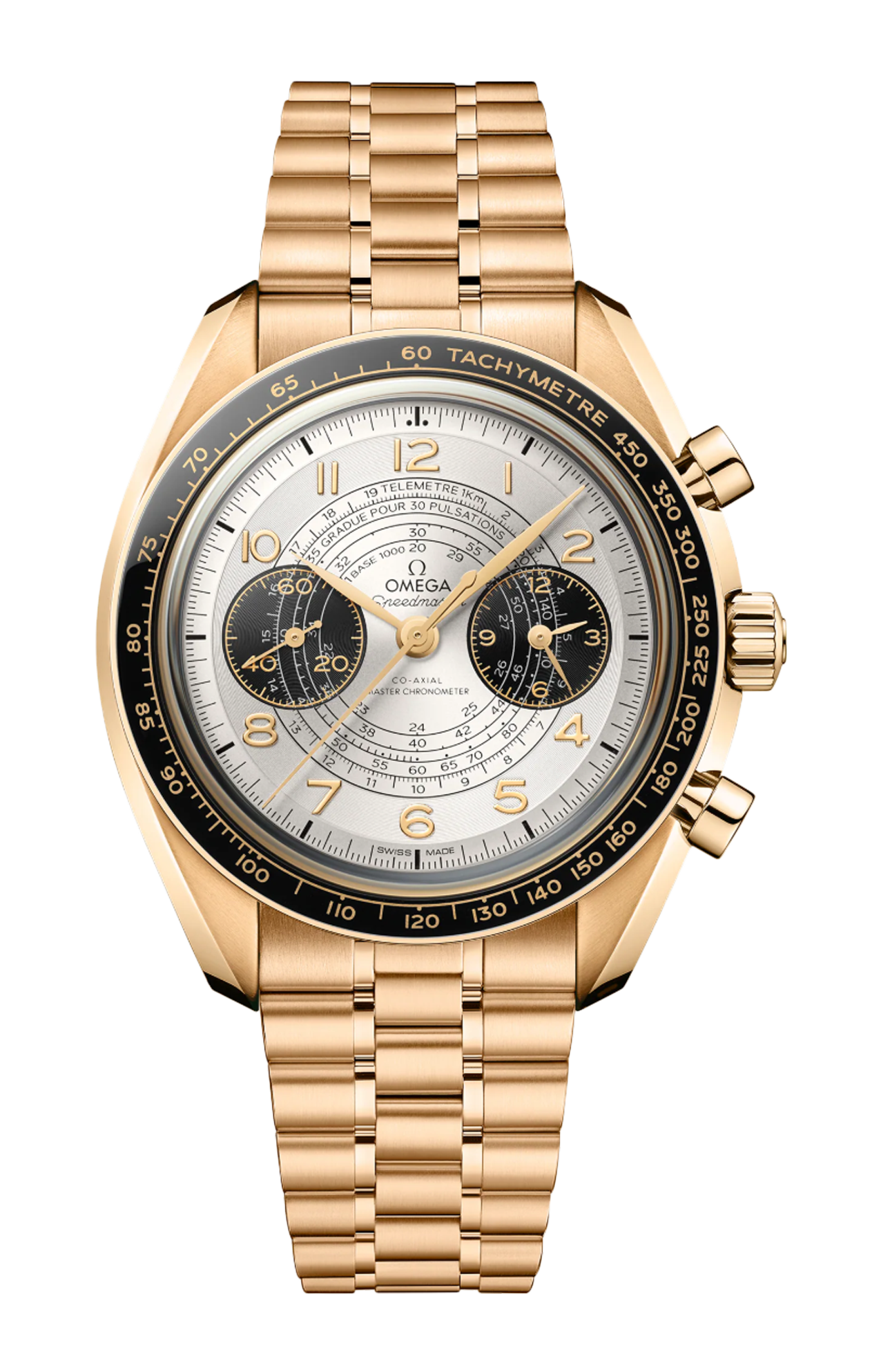Questo modello da 43 mm è un omaggio alle Olimpiadi di Parigi 2024 e sfoggia i tre colori principali dell’evento: oro, nero e bianco. L’orologio è realizzato in oro Moonshine™ 18K e presenta un quadrante bianco argentato opalino con contatori bruniti. Tra le caratteristiche aggiuntive si annoverano l’anello della lunetta in ceramica nera con scala tachimetrica in Ceragold™ Omega, i numeri arabi in oro Moonshine™ 18K e le lancette a foglia e dei contatori con trattamento in PVD oro Moonshine™.