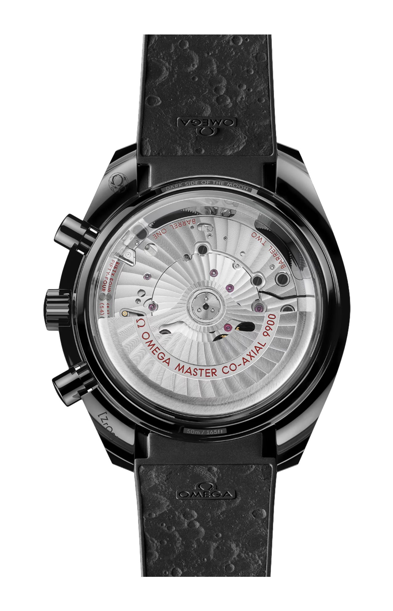 Animato dal calibro Co-Axial Master Chronometer 9900 a carica automatica di Omega, l’orologio è corredato da un cinturino in caucciù nero con interno decorato da un motivo che richiama la superficie lunare, una fibbia déployante in ceramica e componenti incernierati a molla realizzati in titanio ceramizzato.