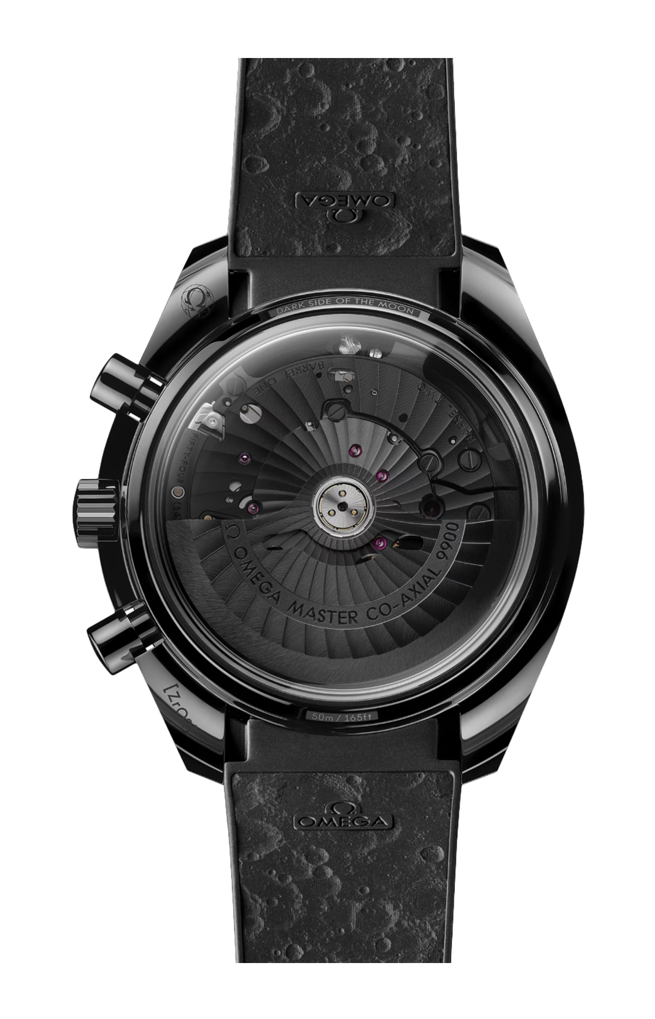 Visibile attraverso il fondello, il calibro Co-Axial Master Chronometer 9900 a carica automatica di Omega presenta una speciale finitura “Black Edition”, che include la brunitura opaca di rotore, platina principale e ponti, nonché incisioni laccate nere. L’orologio è corredato da un cinturino in caucciù nero con interno decorato da un motivo che richiama la superficie lunare, una fibbia déployante in ceramica e componenti incernierati a molla realizzati in titanio ceramizzato.