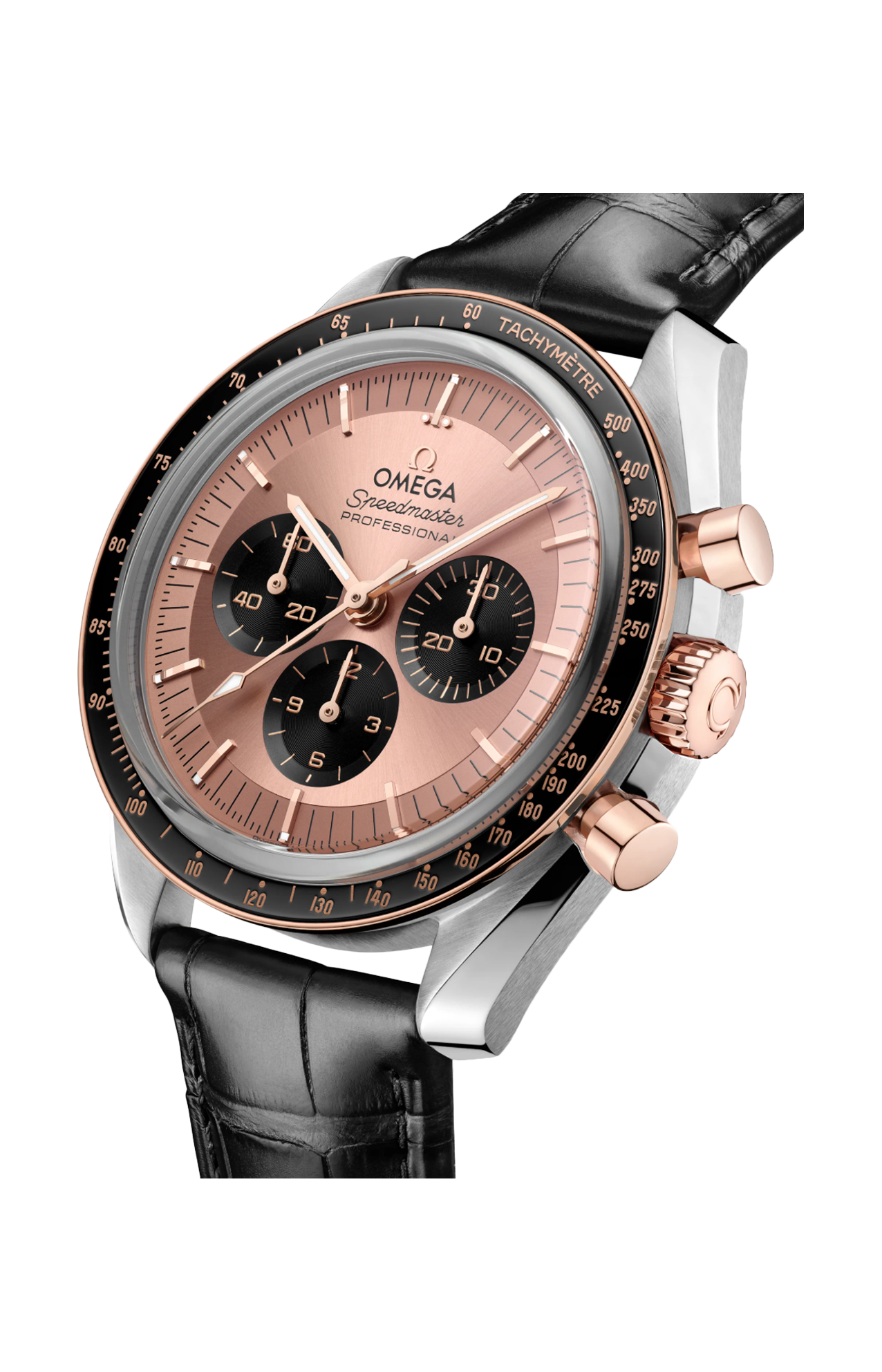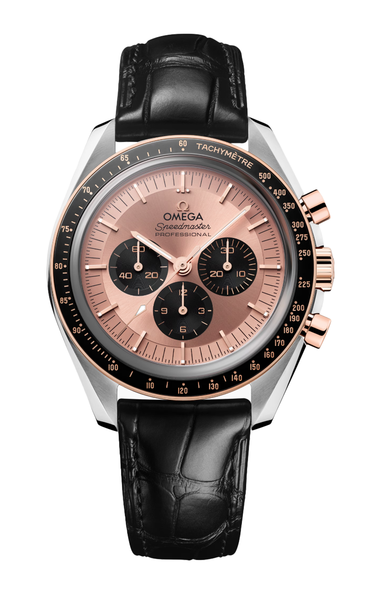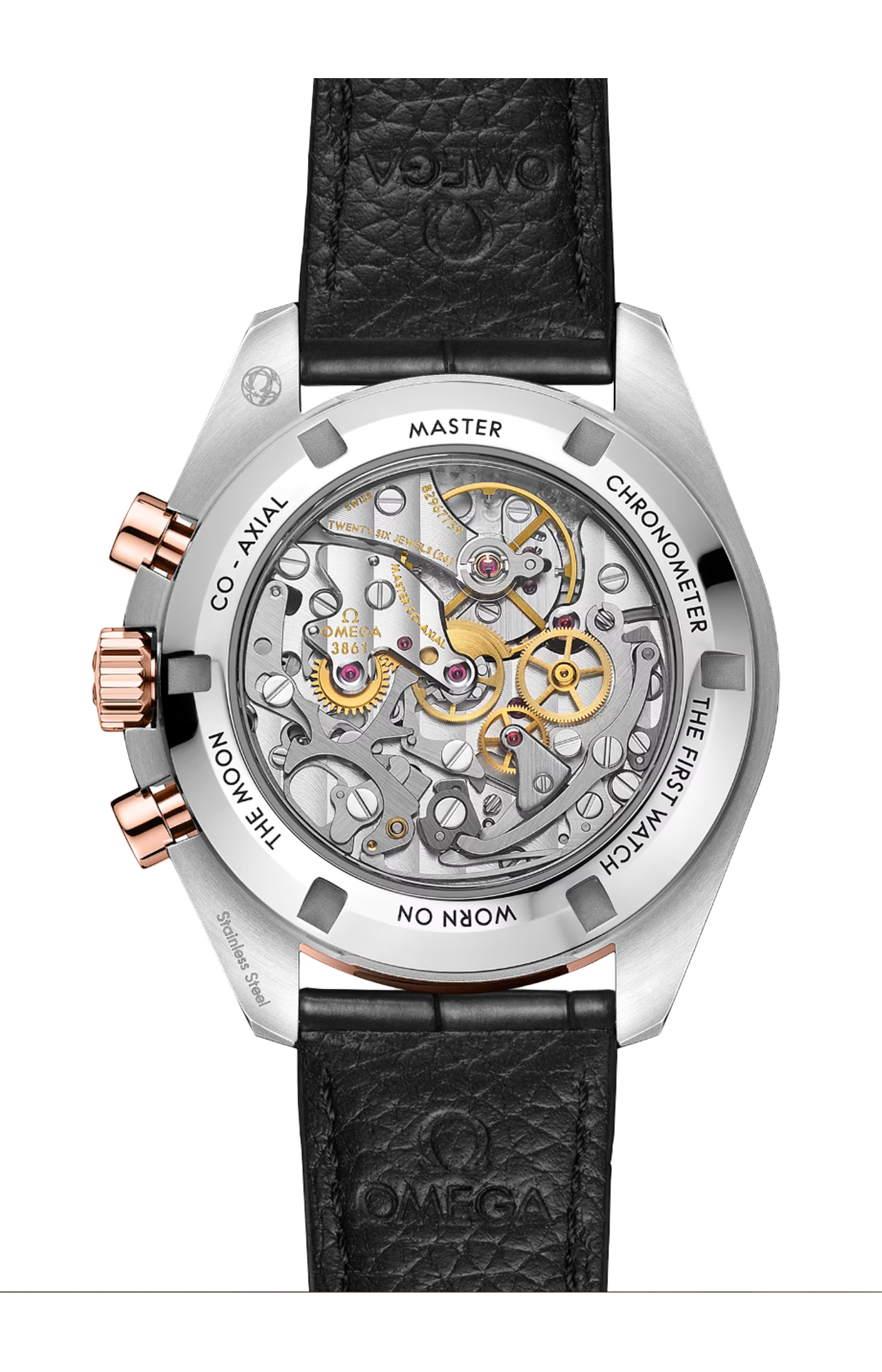L’orologio è dotato di un cinturino in pelle di alligatore nera e animato dal calibro Omega Co-Axial Master Chronometer 3861.