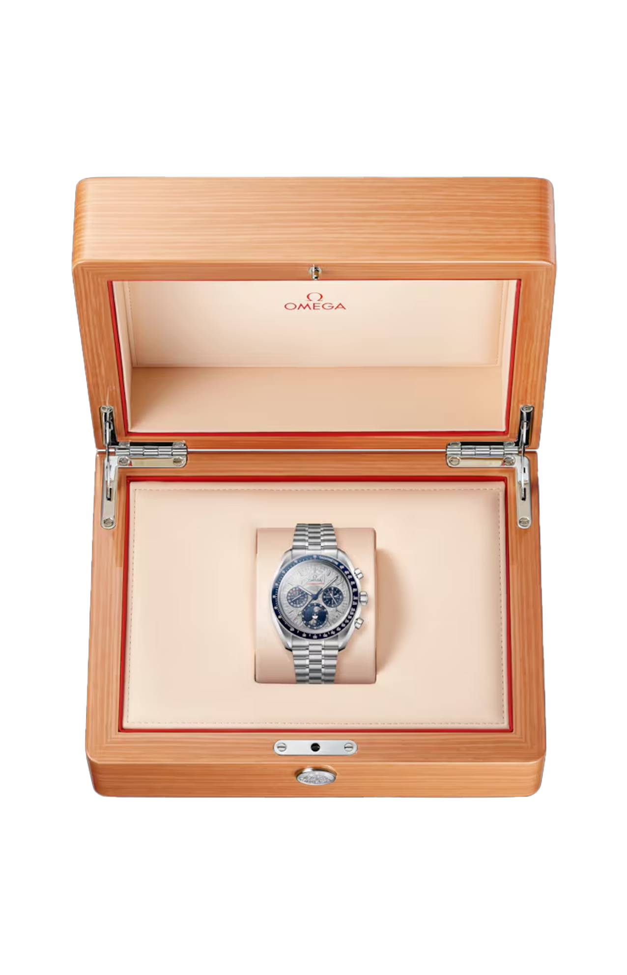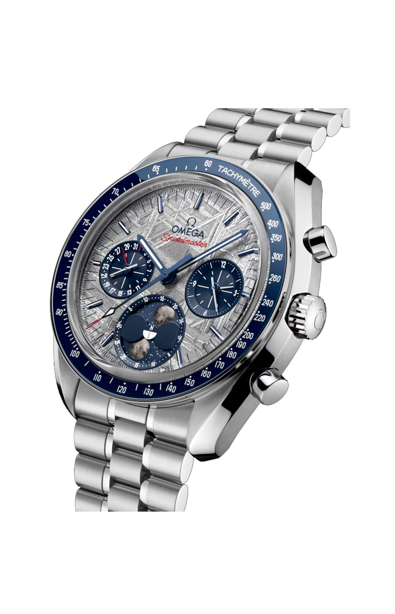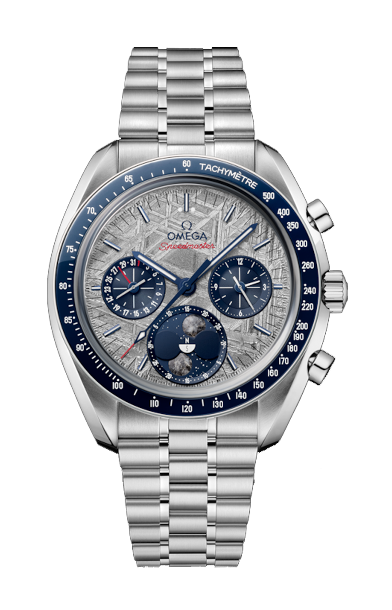 La cassa in acciaio inossidabile lucido e spazzolato è completata da un anello della lunetta in ceramica blu lucida con scala tachimetrica smaltata bianca. Allaccia saldamente al polso questo modello Moonphase un bracciale in acciaio inossidabile lucido e spazzolato dotato del comodo sistema di regolazione brevettato Omega, alla stregua del celebre Speedmaster.