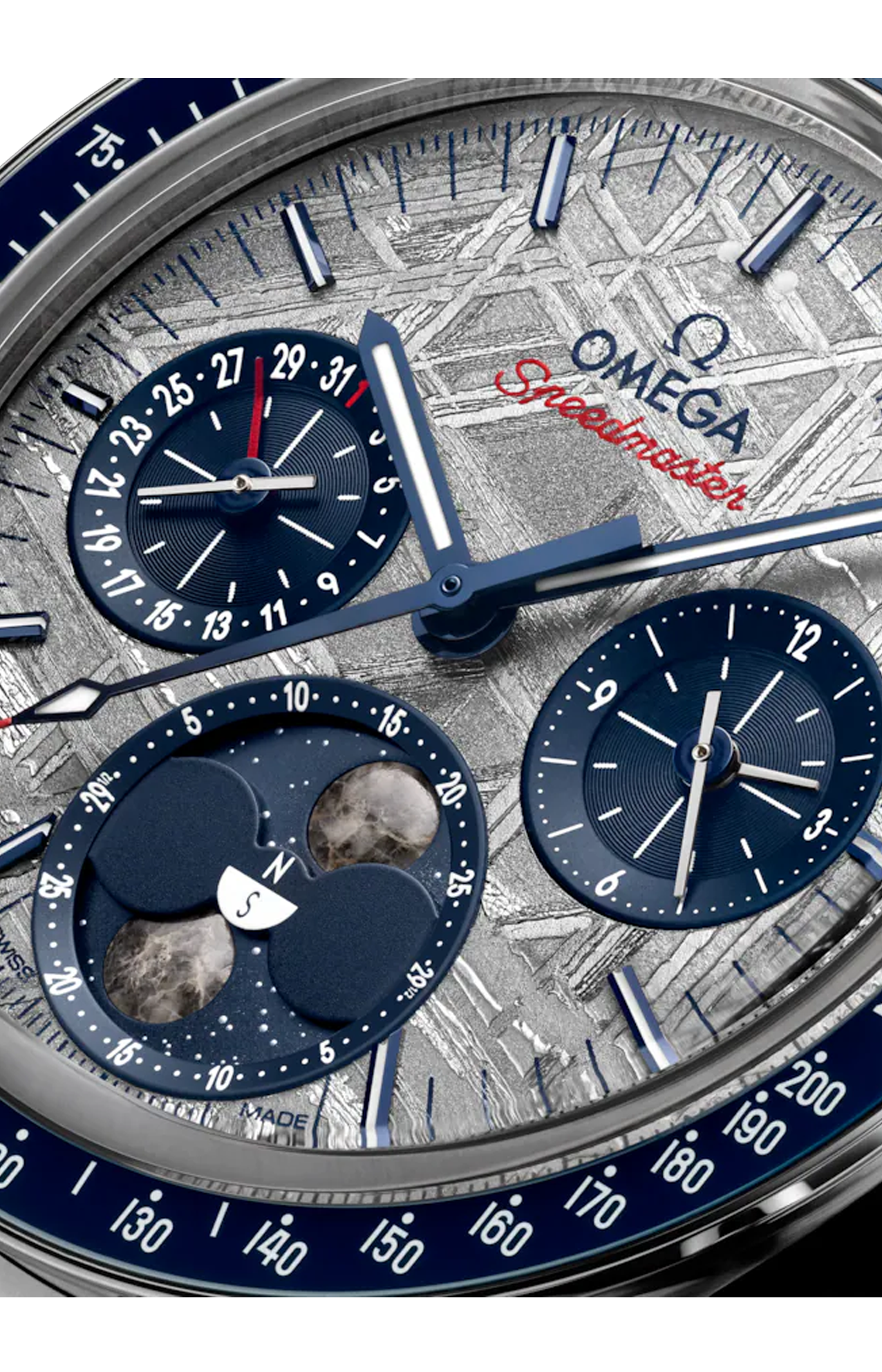 Il quadrante, realizzato a partire da un vero meteorite con rivestimento grigio galvanizzato, vanta lancette delle ore e dei minuti con rivestimento blu e indici in oro bianco 18K. Anche le lancette sui due contatori con rivestimento blu sono in oro bianco 18K.