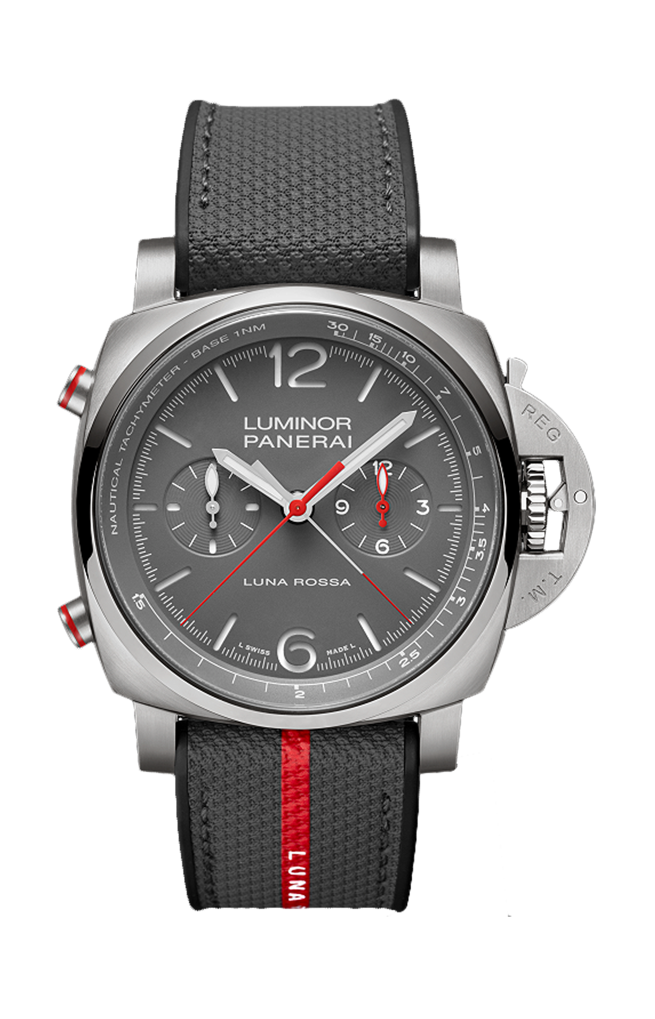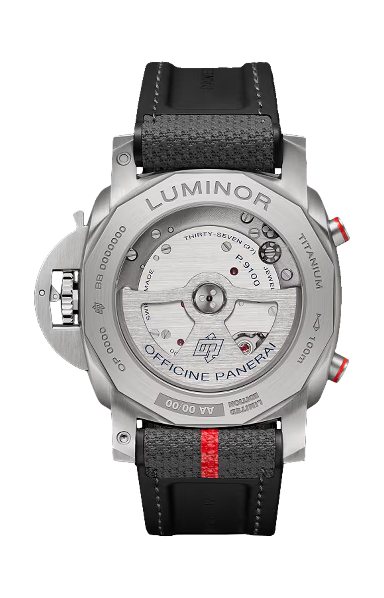 Movimento meccanico a carica automatica, calibro P.9100, 13¼ linee, spessore 8,15 mm, 37 rubini, bilanciere in glucydur®, 28.800 alternanze/ora. Dispositivo antiurto incabloc®. Riserva di carica di 3 giorni, due bariletti. 302 componenti. Funzioni cronografo, ore, flyback, piccoli secondi, minuti. Cassa diametro 44mm, titanio satinato. Lunetta titanio lucido. Fondello a vite, in vetro zaffiro trasparente e titanio. Quadrante grigio opaco, struttura a sandwich, con numeri arabi e indici in super-luminova® bianco. Contatore delle ore cronografiche a ore 3 e contatore dei piccoli secondi a ore 9. Doppie lancette centrali dei secondi cronografici. Impermeabilità 10 ATM. Cinturino in tessuto bi-materiale luna rossa grigio, STD, 24/22, BA con fibbia in titanio satinato trapezoidale, 22 mm. Dispositivo proteggi corona protetto da trademark.