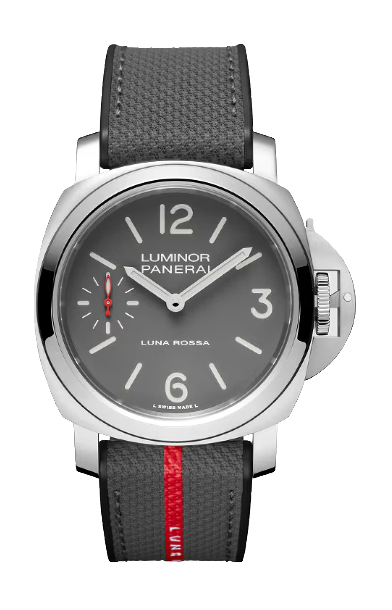 Il quadrante grigio opaco concavo e Super-Luminova® bianco enfatizza la leggibilità e la funzionalità, con la firma Luna Rossa posizionata a ore 6 e il piccolo quadrante rosso dei secondi a ore 9. Il Luminor Luna Rossa garantisce affidabilità e precisione nella regolazione dell'ora grazie al calibro a carica manuale P.6000 con 3 giorni di riserva di carica. L'orologio perfetto per lo sport e le attività quotidiane, con un'impermeabilità di 10 bar (~100 metri). Il cinturino bimateriale nero e grigio con l'emblematica striscia "Luna Rossa" sfoggia un design sportivo-casual. Un secondo cinturino in caucciù nero è incluso nella confezione.