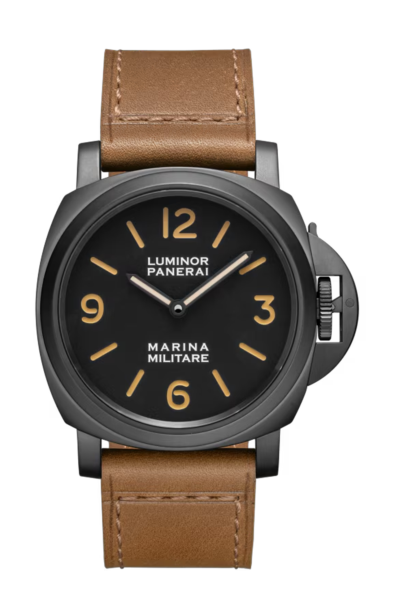 Movimento calibro meccanico a carica manuale P.6000, 15½ linee, 4,5 mm di spessore, 19 rubini, 21.600 alternanze orarie. Dispositivo antiurto Incabloc®. Un bariletto. 110 componenti. Funzioni ore, minuti. Riserva di carica 3 giorni. Cassa e lunetta in acciaio DLC. Fondello chiuso serrato a vite in acciaio, con dicitura Officine Panerai, logo OP e caratteristiche dell’orologio incise. Quadrante monostrato, inciso e svuotato, nero opaco con Super-Luminova® color caramello e dicitura Marina Militare a ore 6. Cinturino in pelle di vitello marrone dorato con cucitura tono su tono, fibbia trapezoidale in acciaio sabbiato nero DLC cucita al cinturino. Cinturino aggiuntivo in caucciÙ nero e fibbia di ricambio. ImpermeabilitÀ: 30 atmosfere (~300 metri).