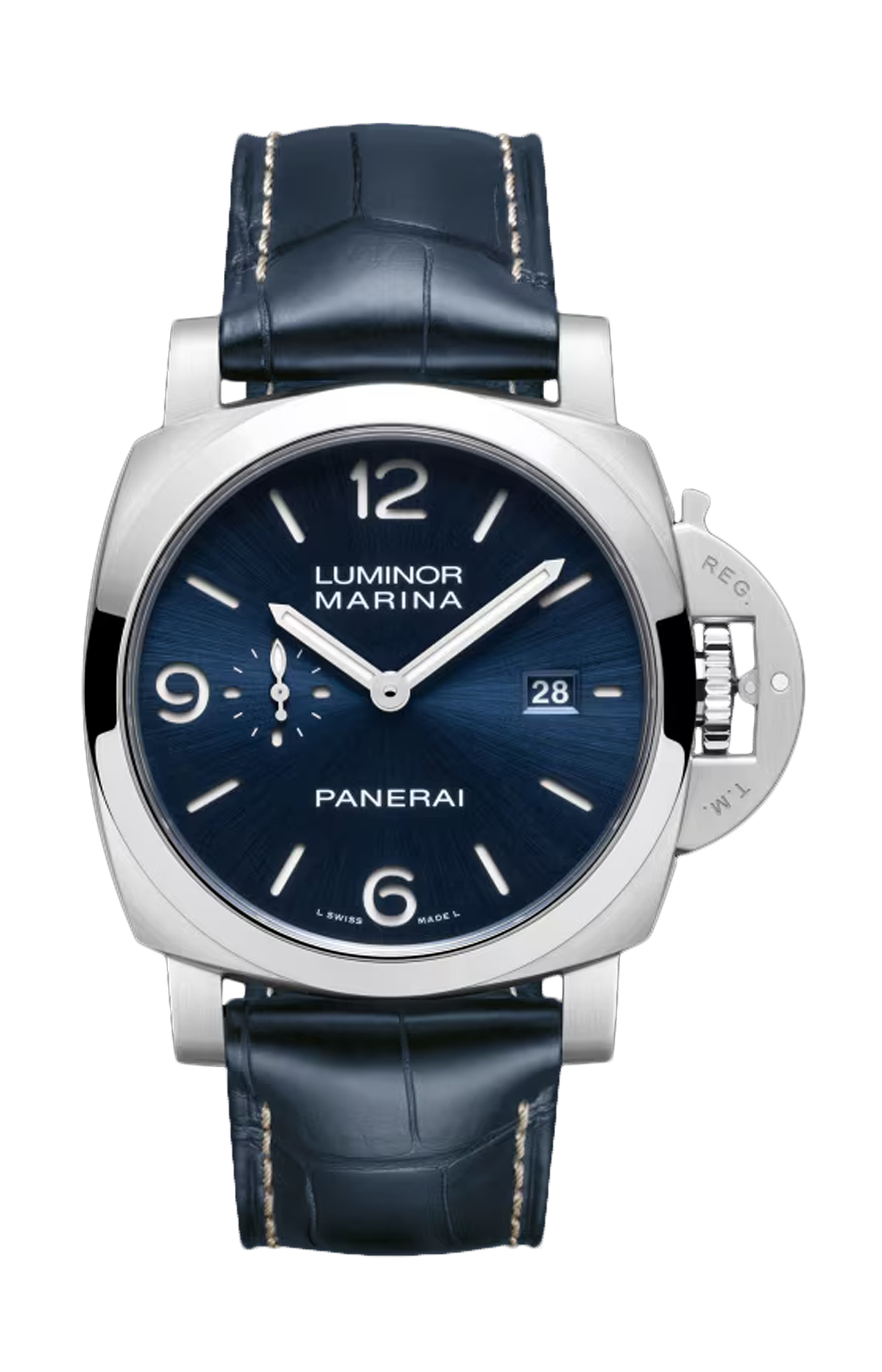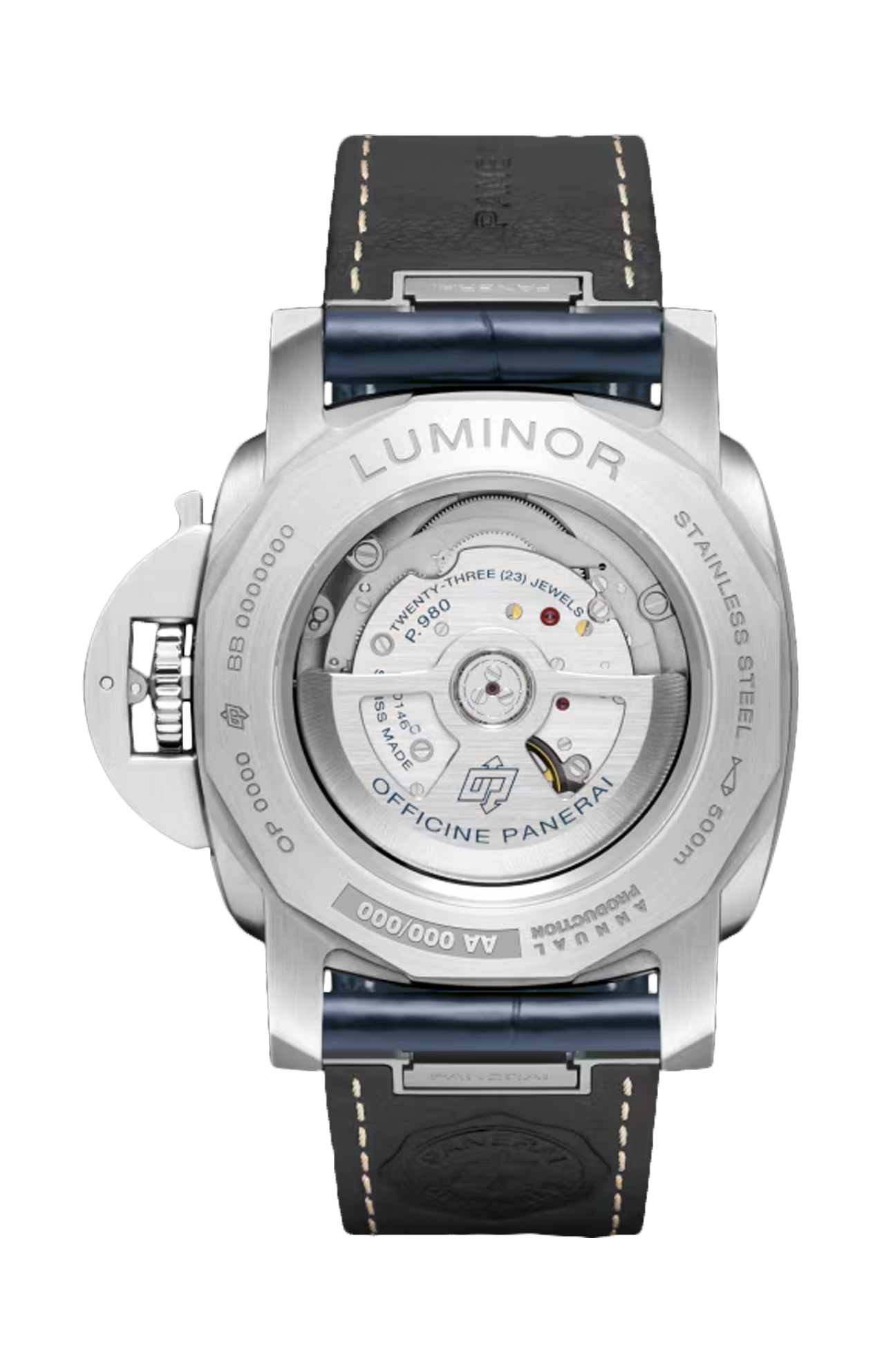Il nuovo Luminor Marina introduce aggiornamenti chiave che ne affinano le prestazioni, la resistenza e il comfort, preservandone al contempo l'identità emblematica. La collezione presenta ora una maggiore resistenza all'acqua fino a 50 bar (~500 metri), stabilendo un nuovo standard per il Luminor Marina. L'introduzione del movimento P.980 garantisce la precisione con una riserva di carica di tre giorni, offrendo una maggiore stabilità grazie al ponte del bilanciere passante. I nuovi modelli incorporano il Super-Luminova® X2, un materiale luminescente di nuova generazione che offre una maggiore luminosità, garantendo una leggibilità ottimale in tutte le condizioni di illuminazione. Secondo cinturino caucciù blu scuro.