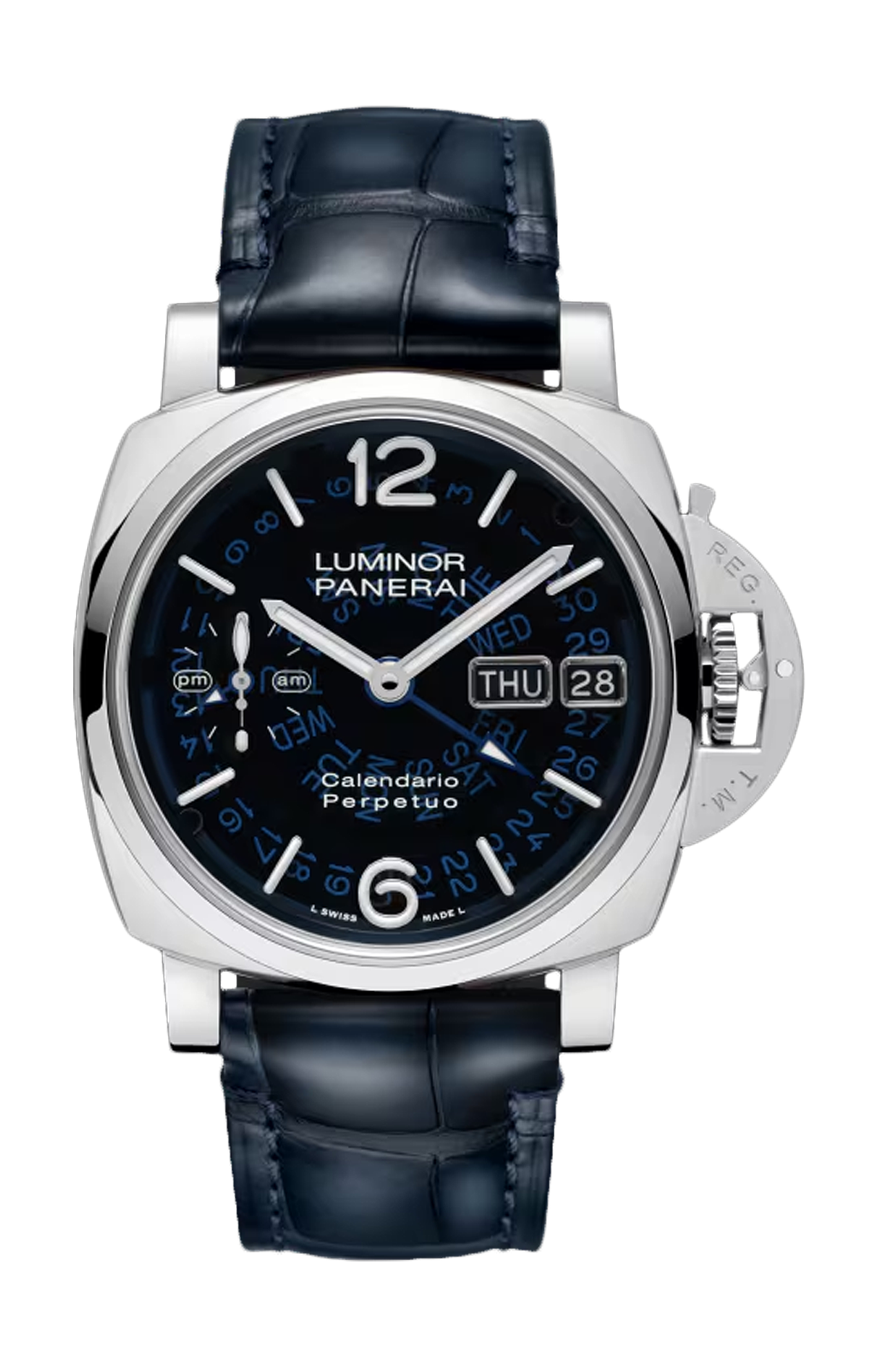 Il Luminor Perpetual Calendar è progettato per la massima chiarezza, con un quadrante in vetro zaffiro che migliora la profondità e la visibilità. Il raffinato design assicura la leggibilità immediata delle funzioni giorno, data e GMT. Le lancette e gli indici luminescenti con Super-Luminova® X2 offrono una maggiore luminosità per una leggibilità ottimale anche in condizioni di scarsa illuminazione. Il contatore dei piccoli secondi rodiato offre un riferimento chiaro, mentre l’ampio datario ottimizza la leggibilità.