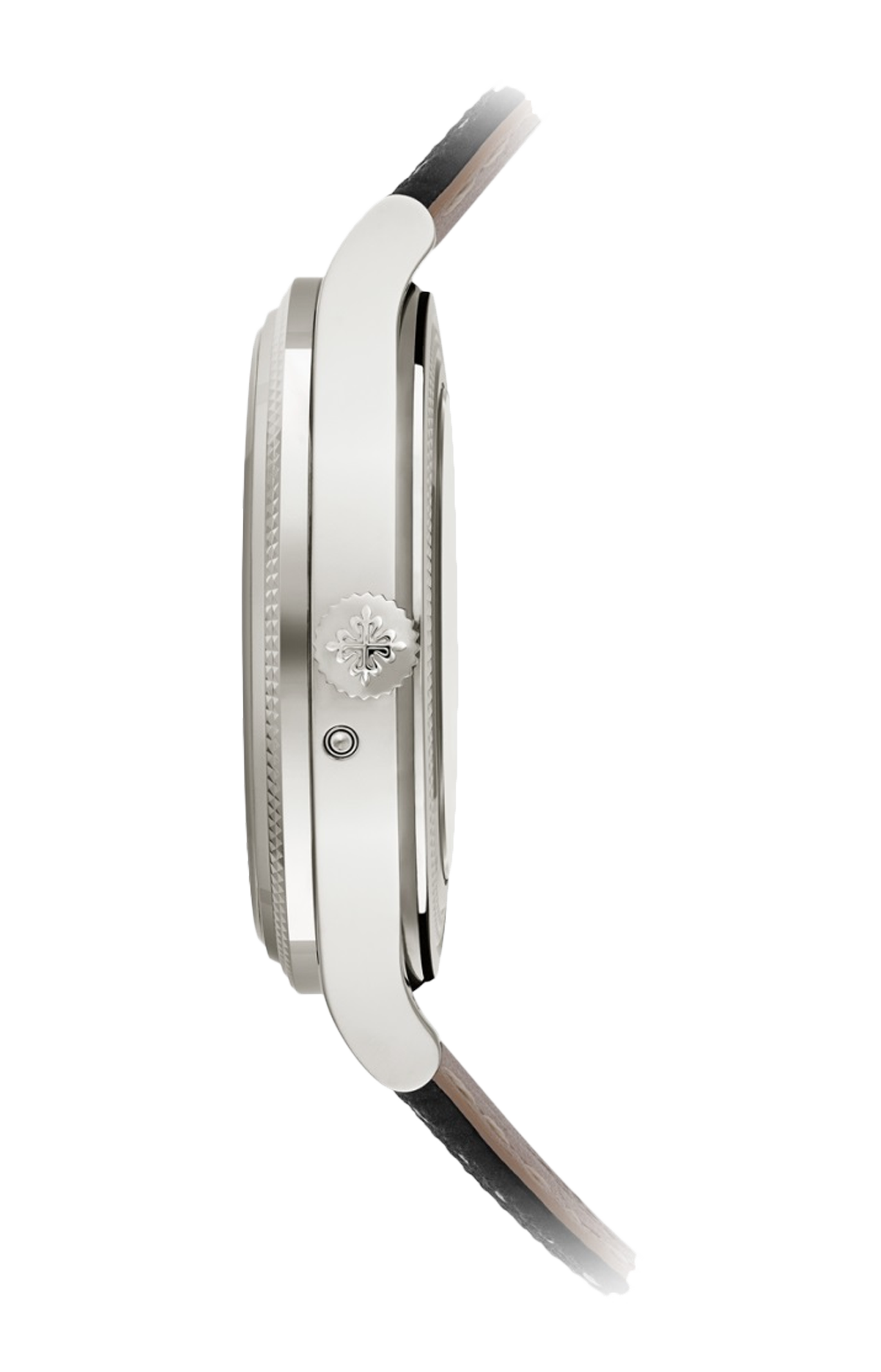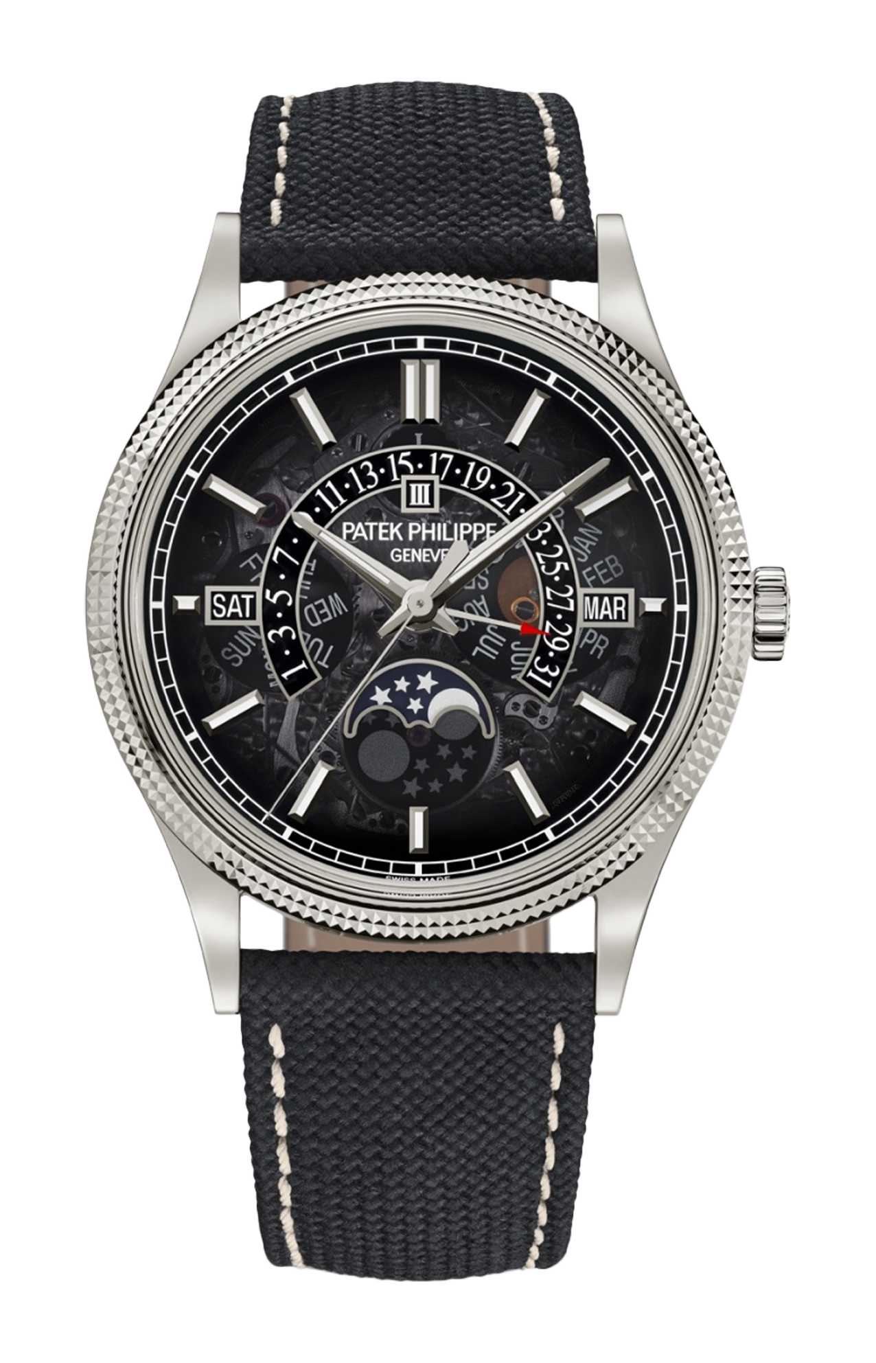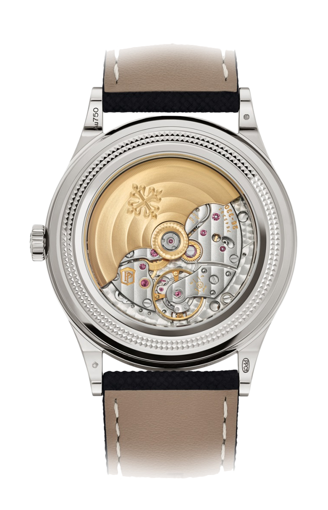 Patek Philippe reinterpreta il calendario perpetuo con lancetta data retrograda in una nuova versione in oro bianco dallo stile originale e contemporaneo, con quadrante in cristallo di zaffiro metallizzato grigio che lascia intravedere in trasparenza il cuore meccanico dell’orologio. La visualizzazione della data retrograda, i riquadri delle finestrelle del giorno, del ciclo degli anni bisestili, del mese e delle fasi lunari sono sottolineati da un filetto di colore grigio galvanico. La lunetta e il fondo sono impreziositi dal famoso motivo guilloché clous de Paris, uno degli emblemi più raffinati dello stile Patek Philippe.